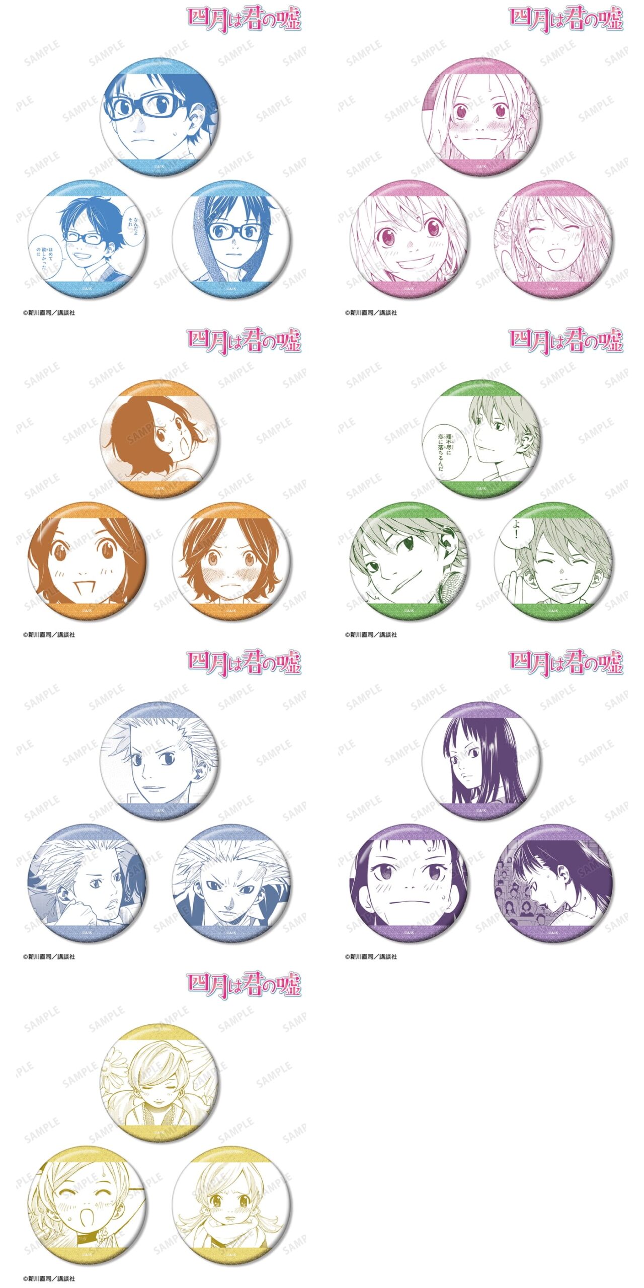 有馬公生、宮園かをり、澤部椿、渡亮太、相座武士、井川絵見、相座凪の原作コマイラストを缶バッジに仕上げました。