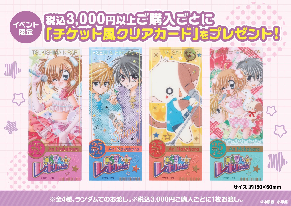 さらに、グッズをお買い上げ3,000円(税込)ごとに特典として描き下ろしノベルティ「チケット風クリアカード 全4種」をランダムに1枚プレゼント!