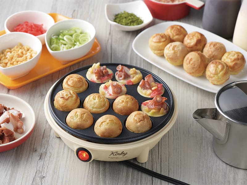 「星のカービィ」家電シリーズは、カービィやワドルディの焼き型がつく「電気たこ焼き器」、カービィとワドルディの「焼き目のつくポップアップトースター」、倒れてもこぼれにくいタイプの「電気ケトル 1.0L」の3アイテムがラインナップ!