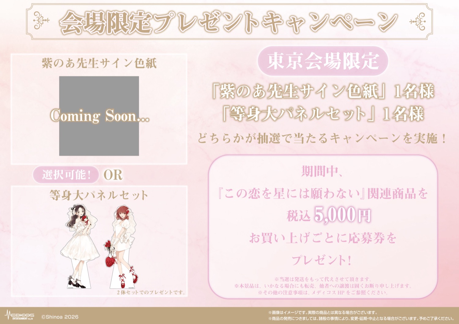 さらに、『この恋を星には願わない』関連商品を1,000円(税込)お買い上げごとに特典「クリアカード(全6種)」がランダムで1枚プレゼントされる他、東京・大阪会場それぞれで展示された「紫のあ先生サイン色紙」、「等身大パネルセット」どちらかが抽選で当たるキャンペーンも!