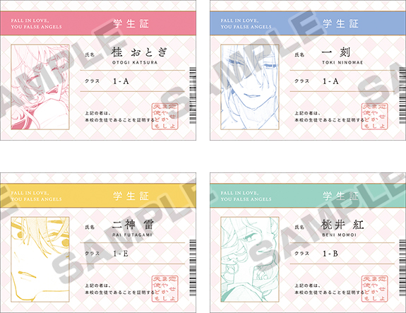 『恋せよまやかし天使どもフェア 2026』では、新作のグッズが販売される他、グッズをお買い上げ1,100円(税込)ごとに特典として描き下ろしノベルティー「学生証風カード 全4種」をランダムに1枚プレゼント!