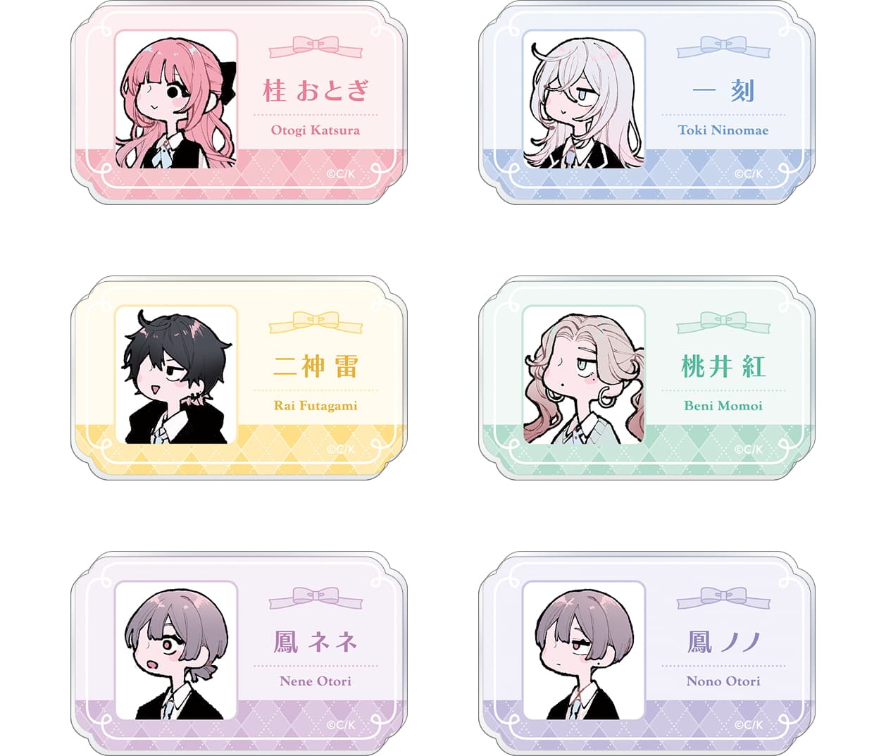 ■種類:(全6種)桂 おとぎ, 一 刻, 二神 雷, 桃井 紅, 鳳 ネネ, 鳳 ノノ
