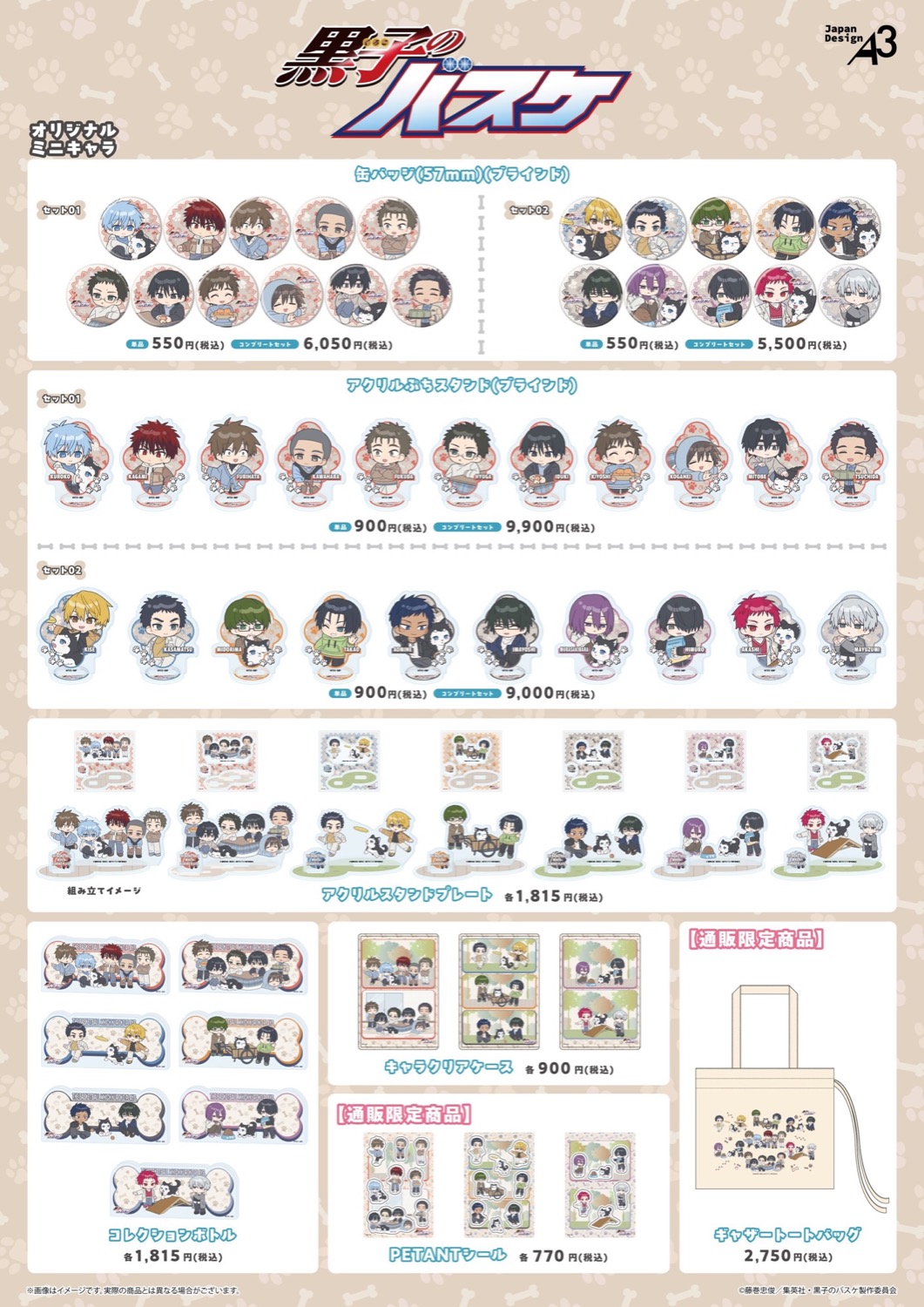 「黒子のバスケ」ポップアップストアでは、テツヤ2号といっしょがテーマのミニキャライラストを使用したグッズが多数販売される。