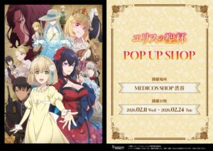常磐くじら先生による人気ライトノベルが原作のアニメ「エリスの聖杯」× メディコス・エンタテインメントのポップアップストアが、MEDICOS SHOP渋谷にて2026年2月11日〜2月24日まで開催される。コンスタンス・グレイル / スカーレット・カスティエルらのイラストを使用した新作グッズが多数ラインナップ!