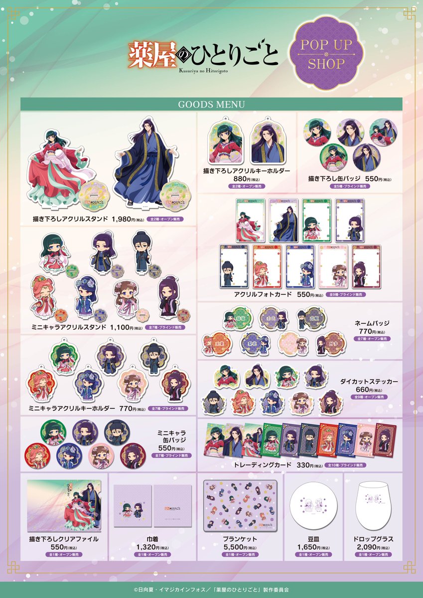「薬屋のひとりごと」ポップアップストアにて、グッズをお買い上げ2,000円毎に特典として「ポストカード 全10種」がランダムに1枚プレゼントされる。