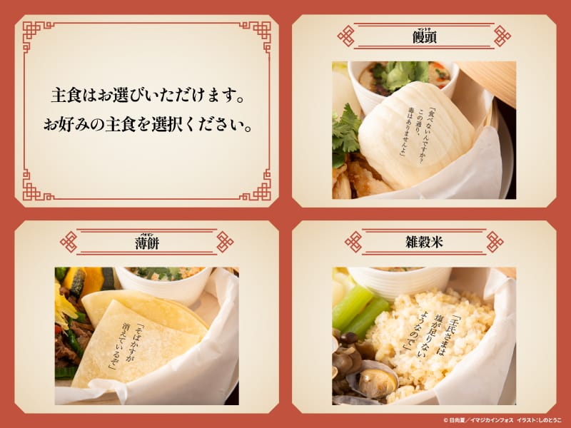 「薬膳」の考え方をベースに『温』『清』『安』を軸とした薬膳喫茶メニューなど、作品の世界観をイメージしたこだわりのメニューが提供される。