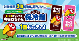 2026年2月24日より全国のファミリーマートにて、対象商品3個と「キョロちゃん 保冷剤 全n種」よりお好きなデザインを1つレジまで持って対象商品を購入すると、ファミリーマート限定の「キョロちゃん」景品をプレゼント!