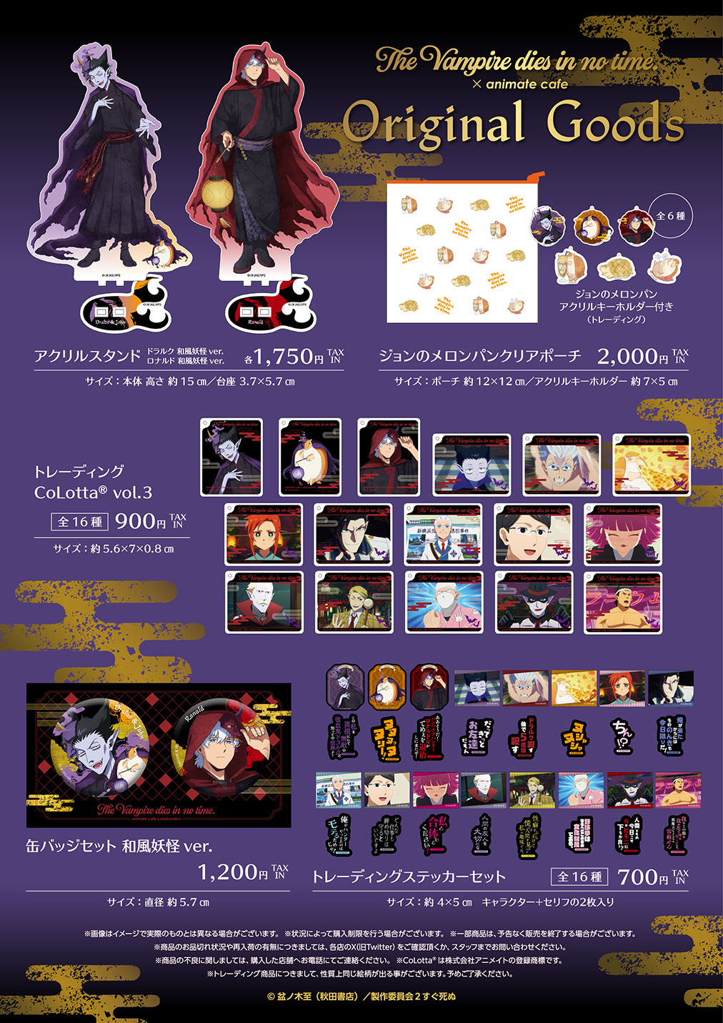 「吸血鬼すぐ死ぬ × アニメイトカフェスタンドHareza池袋」コラボにて、コラボメニューを1品注文するごとに特典として「コースター (全6種)」をランダムに1枚プレゼント!