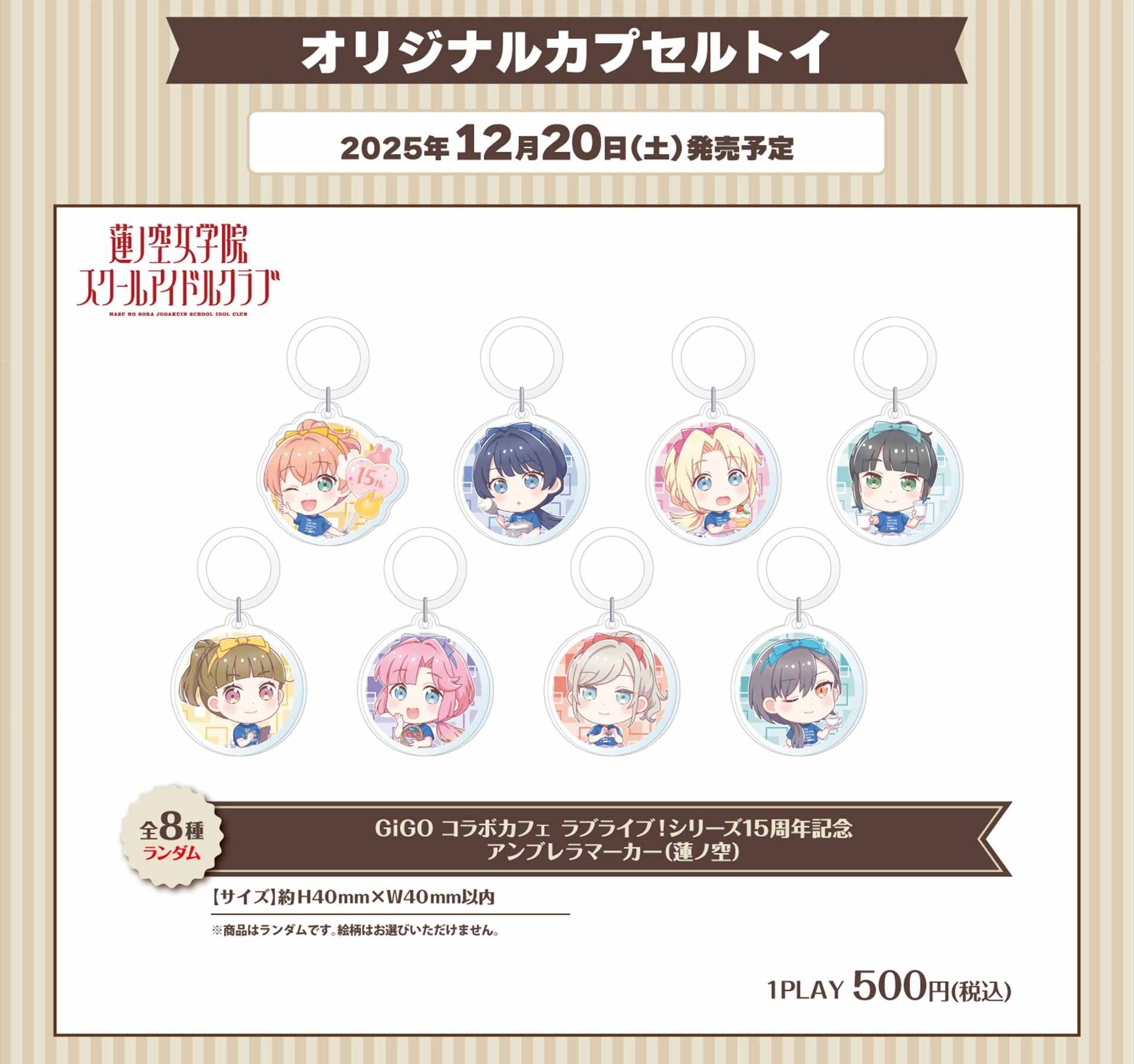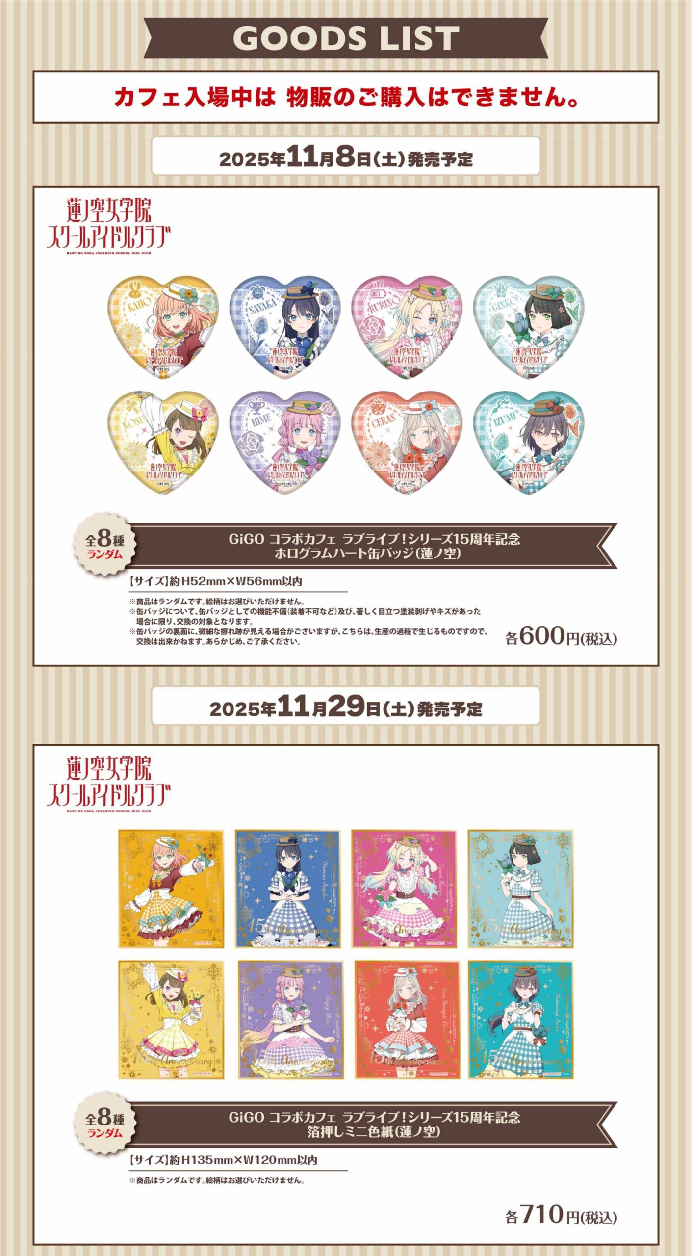 2025年11月8日〜2026年1月4日までの期間開催される、コラボカフェ『GiGOコラボカフェ ラブライブ!シリーズ15周年記念 第3弾(蓮ノ空)』では、「ホログラムハート缶バッジ」や「箔押しミニ色紙」「アンブレラマーカー」などのグッズが登場!