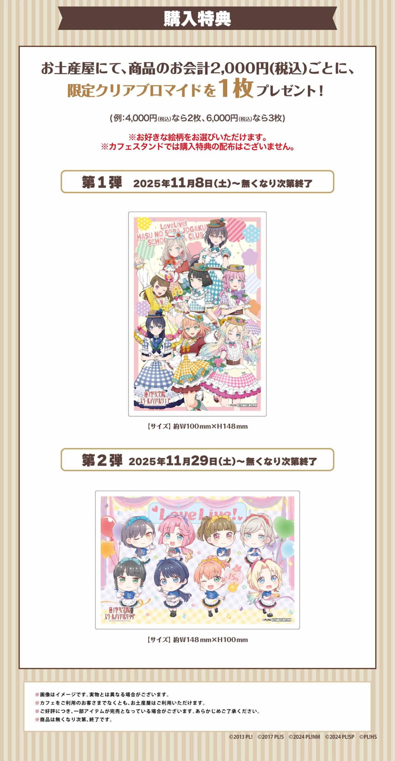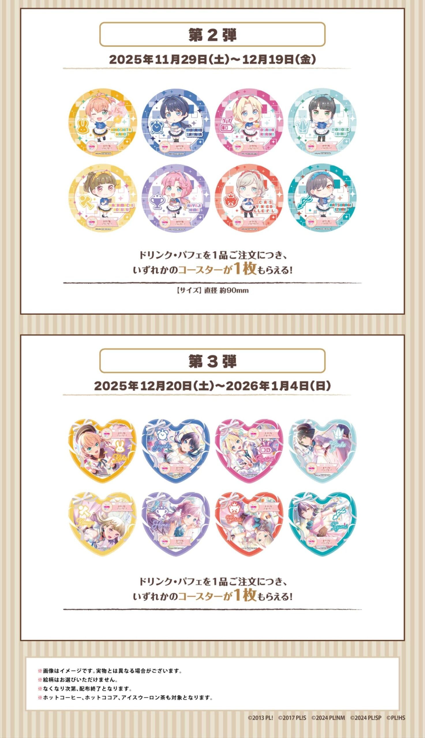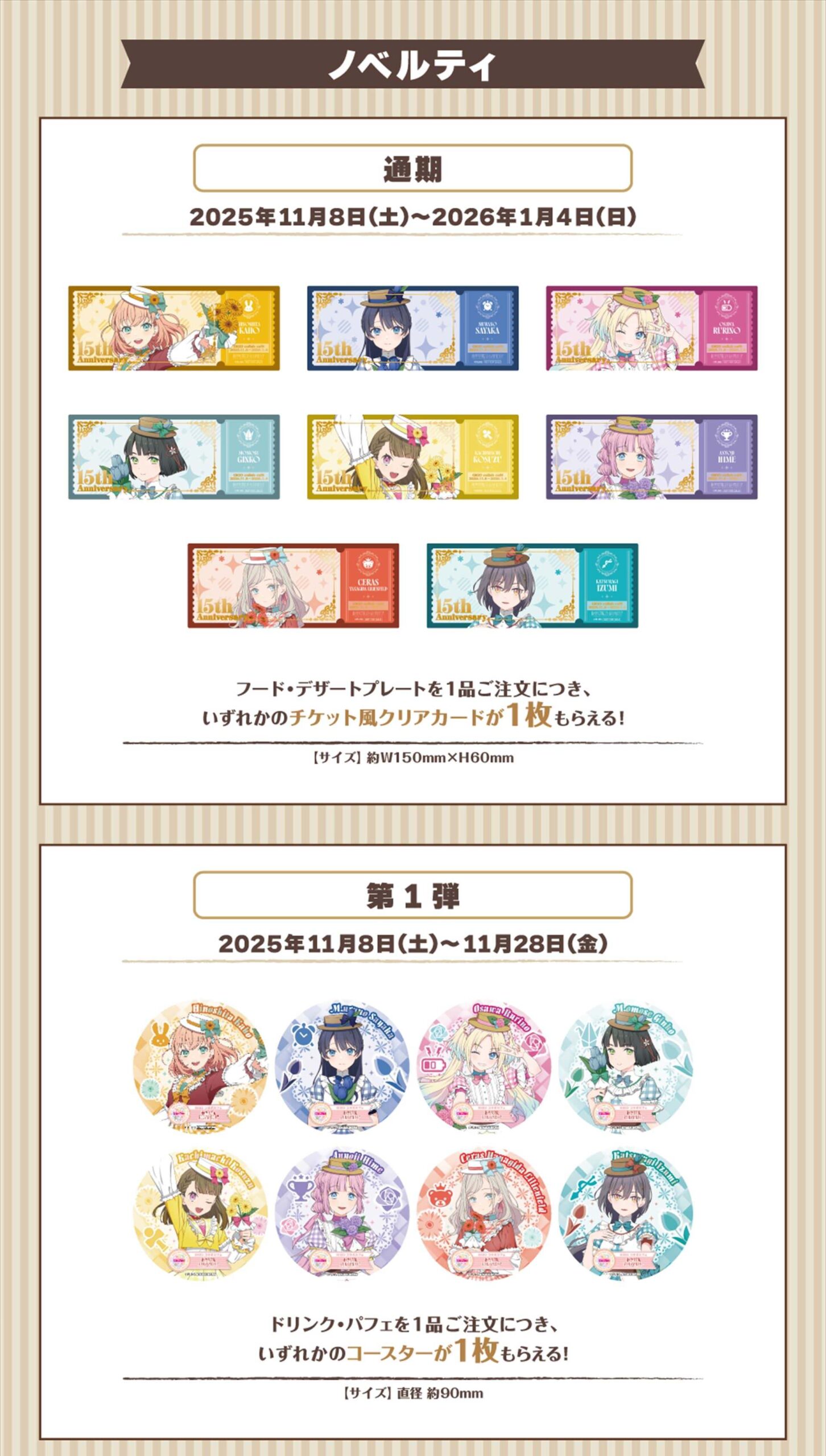 さらに、コラボメニューの注文内容に応じて貰える「チケット風クリアカード」や「コースター」、グッズの購入金額2,000円(税込)ごとに貰える「限定クリアブロマイド」などのオリジナルノベルティーも!