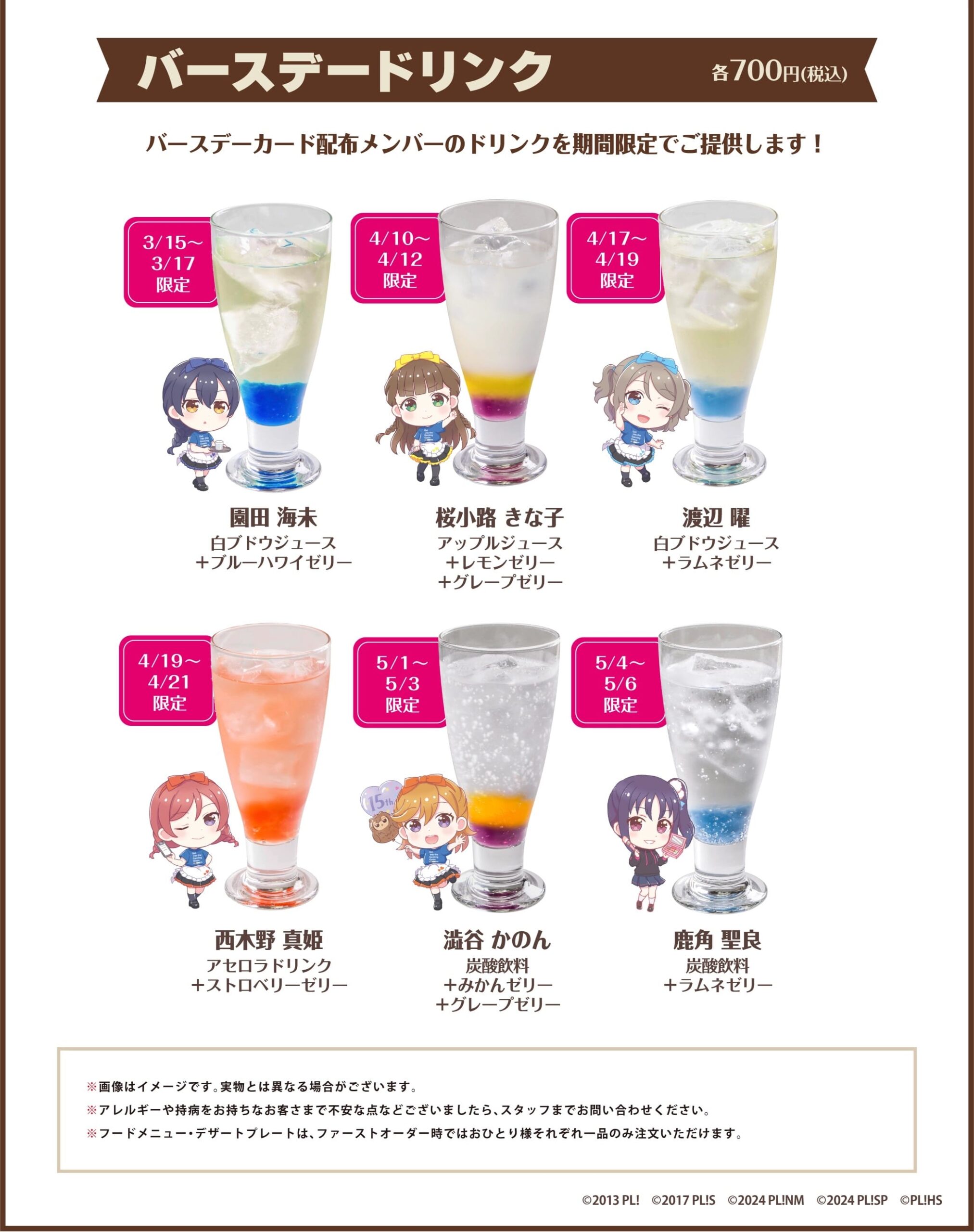 さらに、コラボカフェ開催期間中にバースデーを迎えるメンバーのバースデーカードをプレゼント!期間中にコラボカフェを利用すると会計時に1枚期間に応じたメンバーの「バースデーカード」がプレゼントされる。