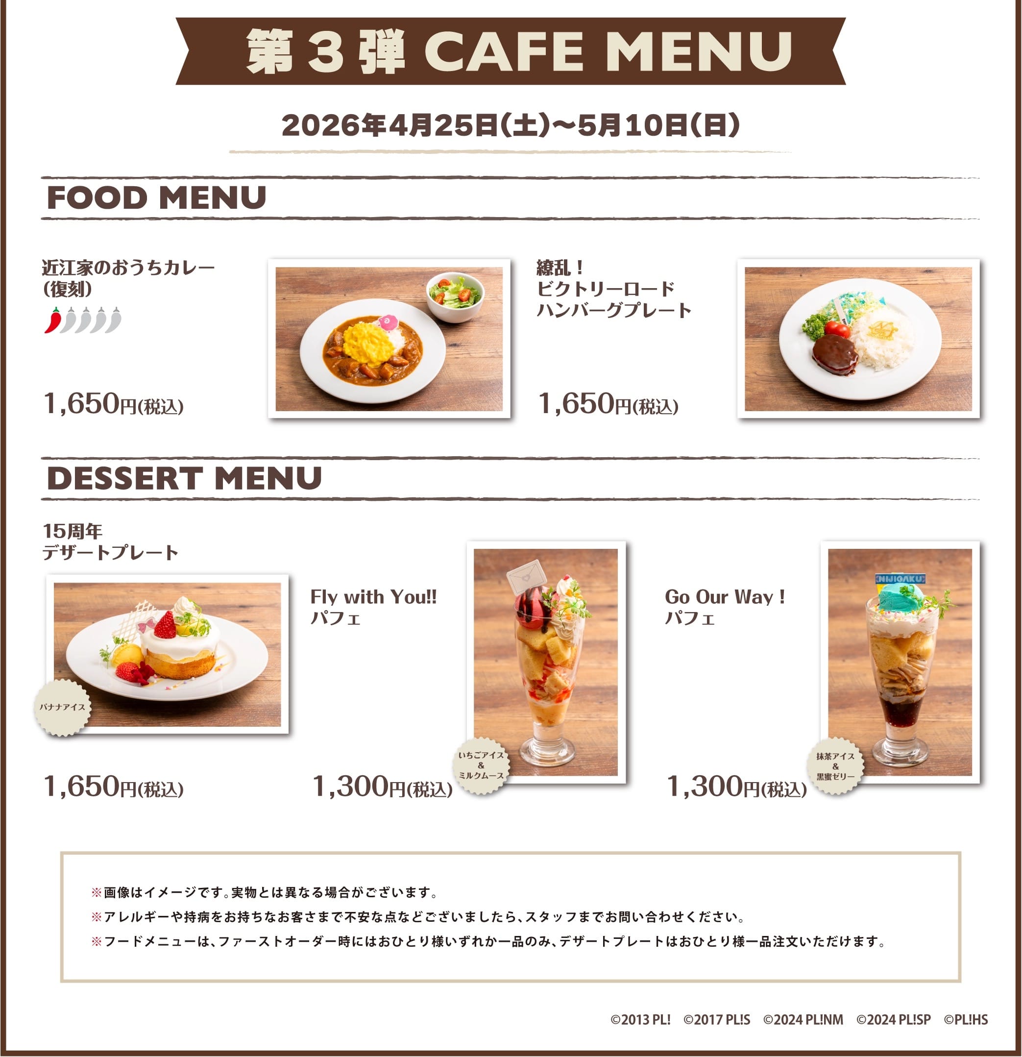 復刻メニューの「せつ菜のスープクラムチャウダー風」や「璃奈ちゃんボードサンドイッチ」や、「Love U my friends お花ちらし寿司」「NEO SKY, NEO MAP! 空色ラーメン」などの新作メニューが期間に応じて順次登場!