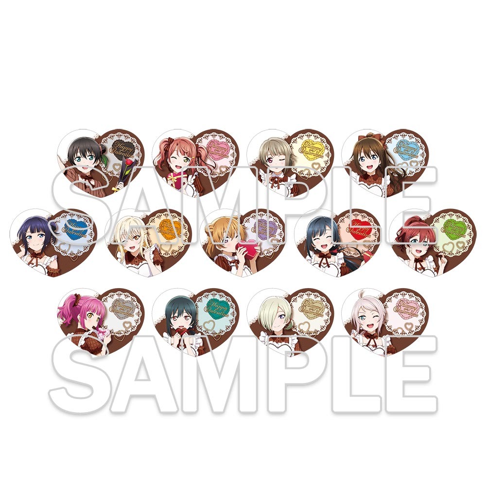 バレンタイン衣装が可愛らしい高咲 侑・中須かすみ・上原歩夢たちのイベント限定描き下ろしイラストを使用した「トレーディングハート缶バッジ」「トレーティングフォトカード」「アクリルスタンド」などがラインナップする。