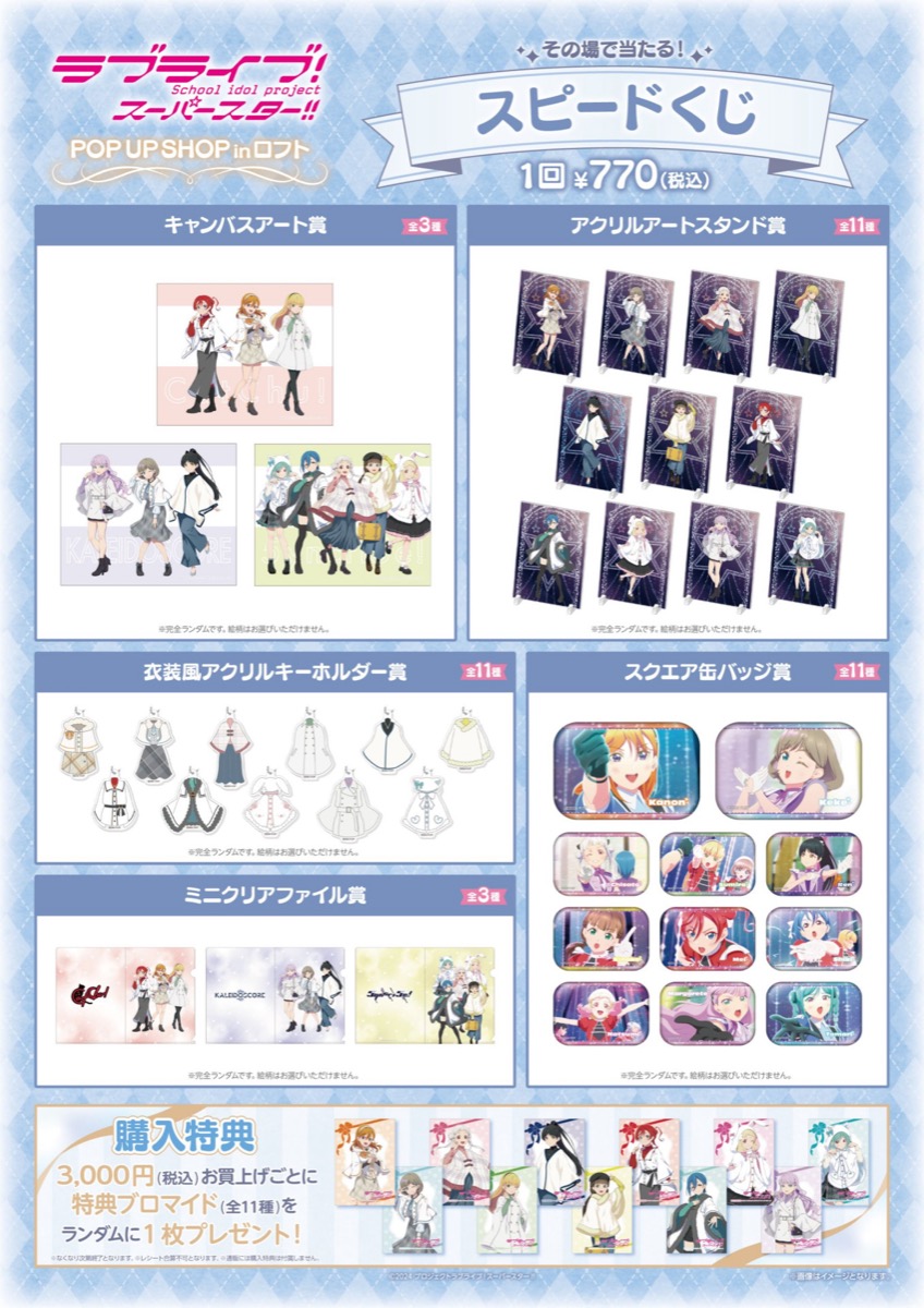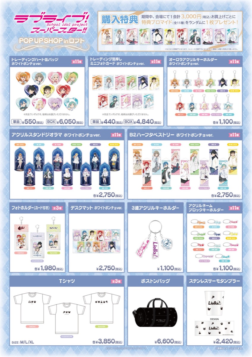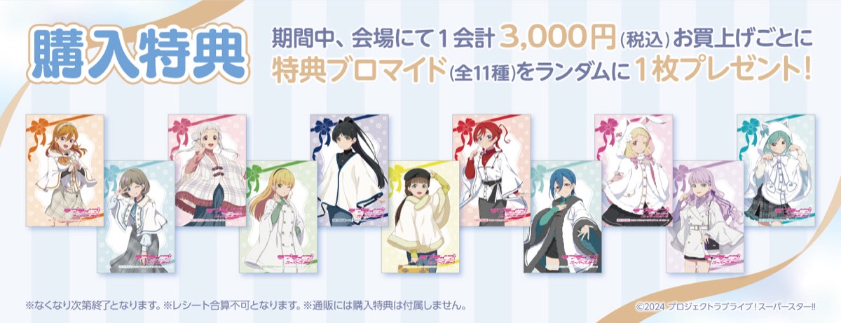 アニメ「ラブライブ!スーパースター!!」ポップアップストアでは、イベント限定の描き下ろしイラスト『ホワイトポンチョVer.』を使用した新作グッズが多数販売される他、グッズをお買い上げ3,000円(税込)ごとに特典として描き下ろしノベルティ「ブロマイド 全11種」をランダムに1枚プレゼント!
