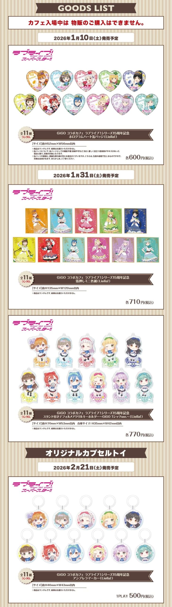 2026年3月8日まで開催される「ラブライブ!」カフェでは、15周年を記念する華やかな衣装の描き下ろしイラストを使用したコラボカフェ限定グッズが多数登場!