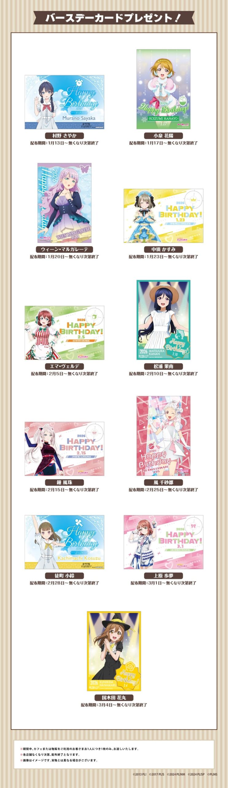 また、イベント期間中に誕生日を迎えるキャラクターのバースデーカードを先着順でお一人につき1枚プレゼント!