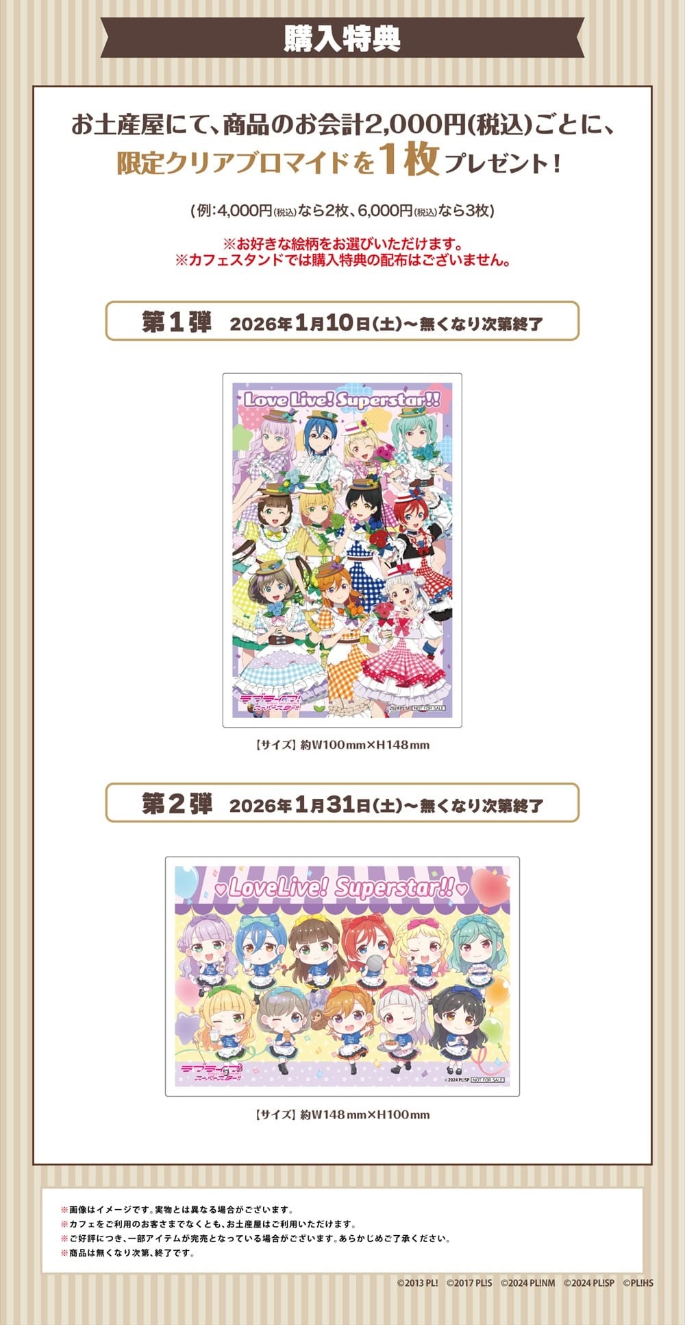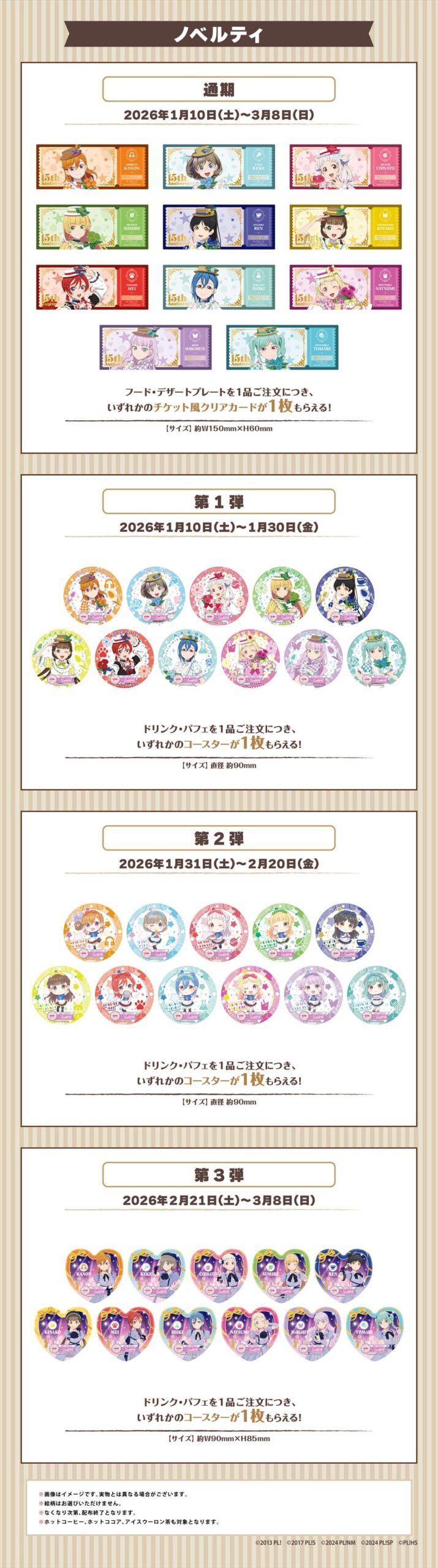 「ラブライブ! 15周年コラボカフェ 第4弾」では、コラボメニューの注文やグッズの購入などに応じて各種ノベルティーをプレゼント。