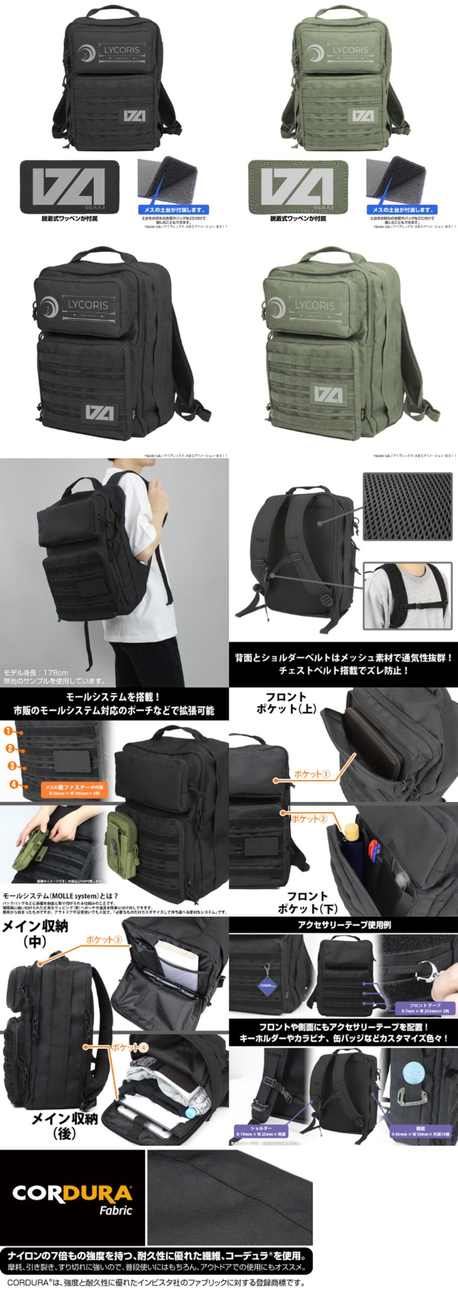 「リコリス・リコイル」リコリス ファンクショナルバックパック (ブラック / レンジャーグリーン) 各14,300円(税込)