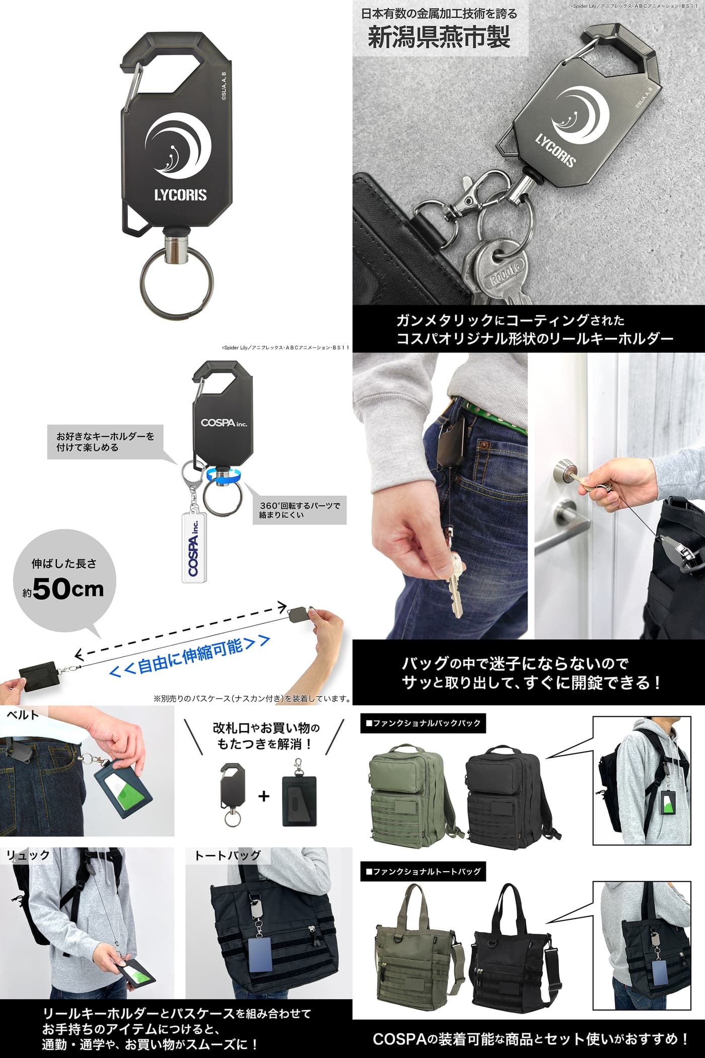 リコリスロゴをモノトーンで配したメタルカラビナやリールキーホルダーは、日常のバッグやベルトループに馴染むデザインが魅力だ。