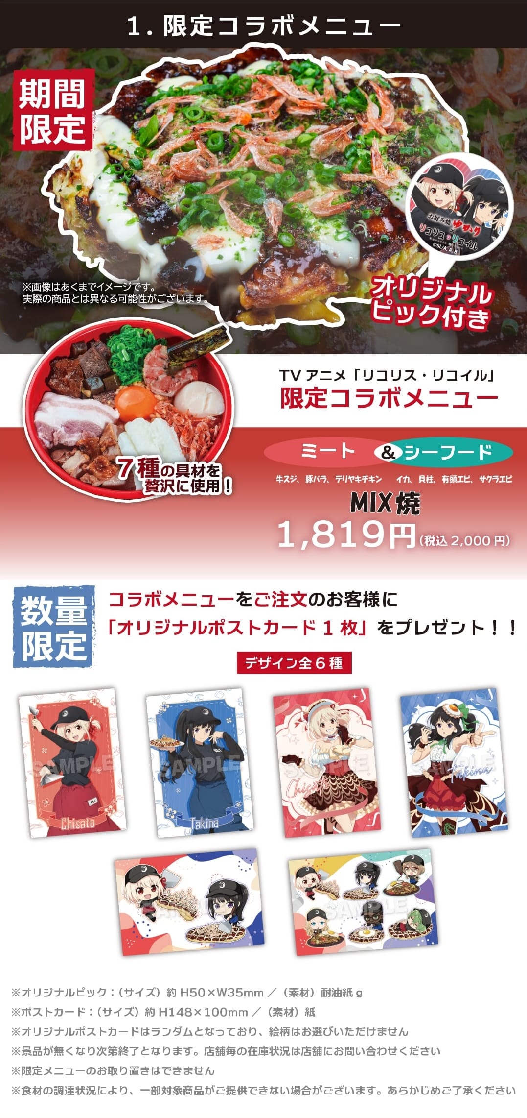 「リコリス・リコイル × お好み焼ゆかり」では、「錦木千束」&「井ノ上たきな」の店員姿や、お好み焼きイメージのコスチューム姿の描き下ろしイラストを使用したコラボ限定グッズやメニューが盛りだくさん!