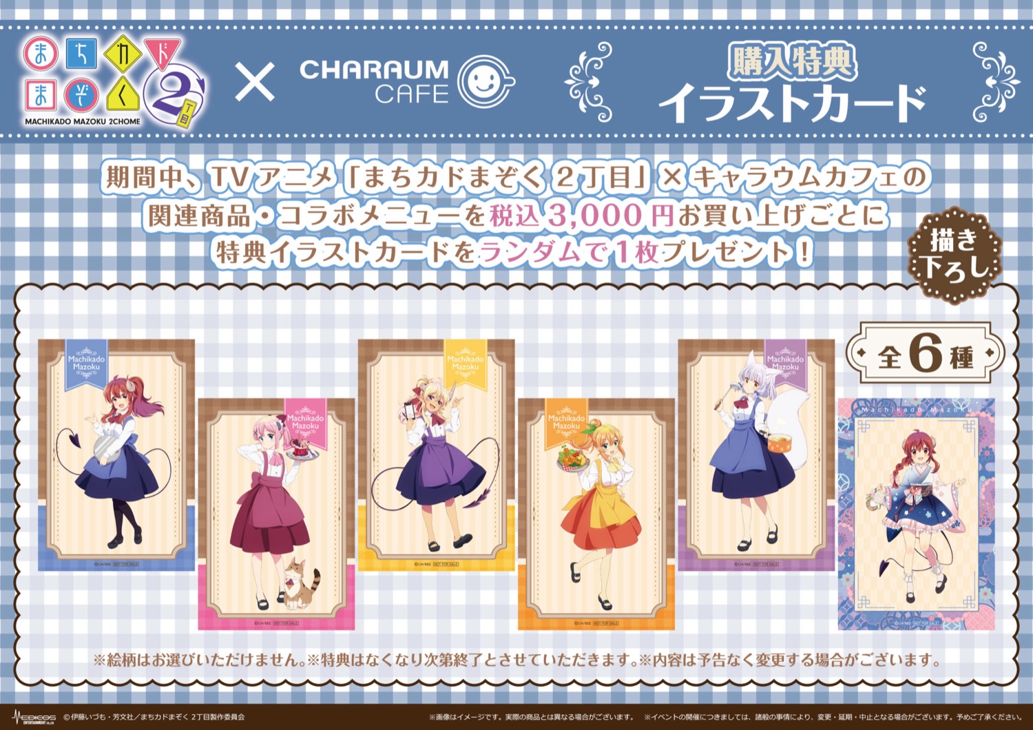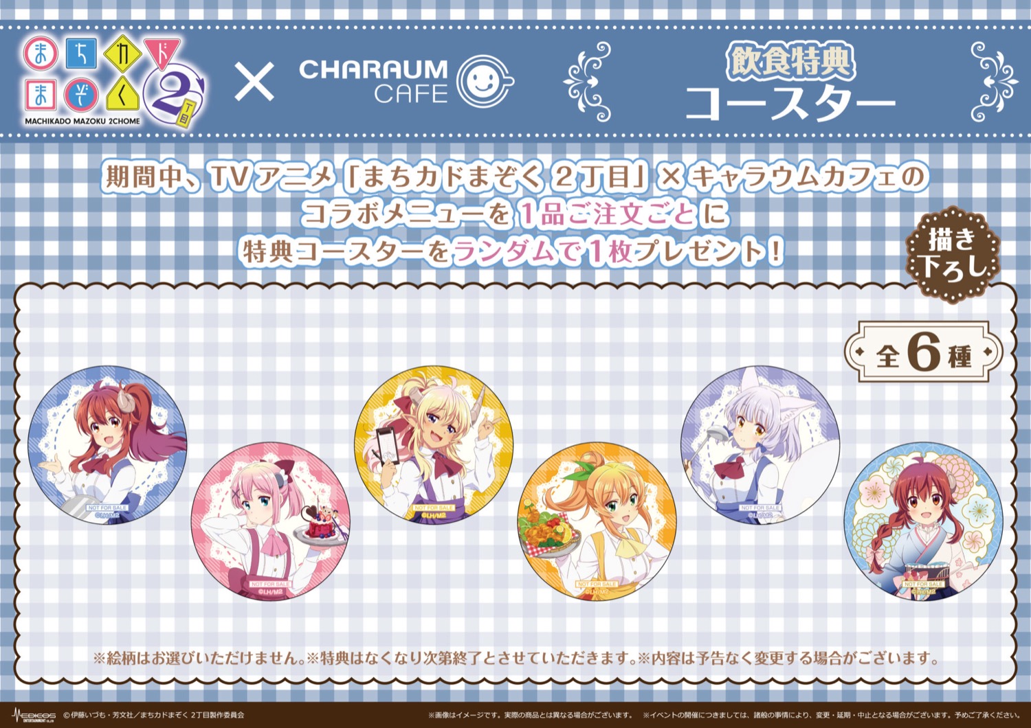 「まちカドまぞく 2丁目 × CAFE EPIC TALE」コラボにて、コラボメニューを1品ご注文ごとに特典「コースター(全6種)」をランダムで1枚、関連商品(コラボメニューを含む)を3,000円(税込)お買い上げごとに特典「イラストカード(全6種)」をランダムで1枚プレゼント!