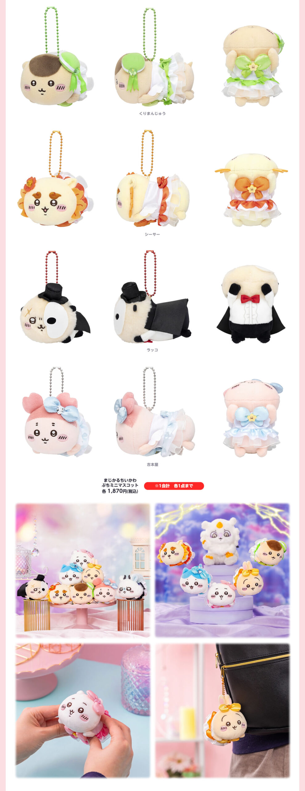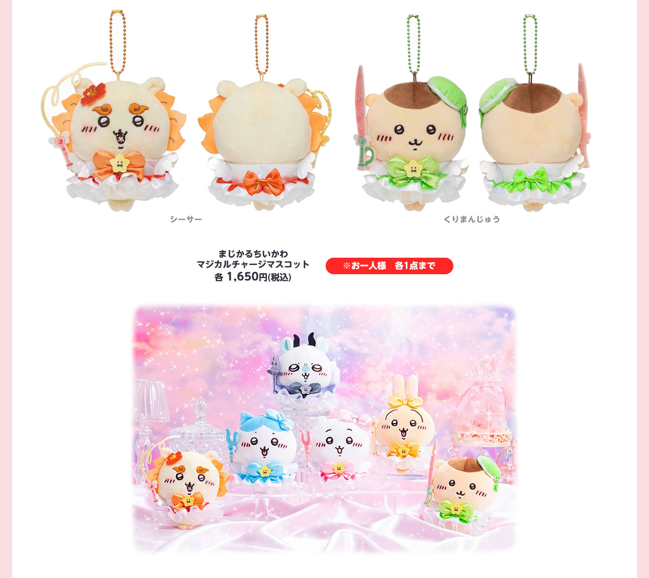 魔法少女アニメ風衣装に身を包む、ちいかわ・ハチワレ・うさぎ・モモンガ・古本屋・シーサー・くりまんじゅう・ラッコたちのデザインを使用した「まじかるちいかわ ぷちミニマスコット」「まじかるちいかわ ショルダーバッグハート」「まじかるちいかわ マジカルチャージマスコット」などがラインナップする。