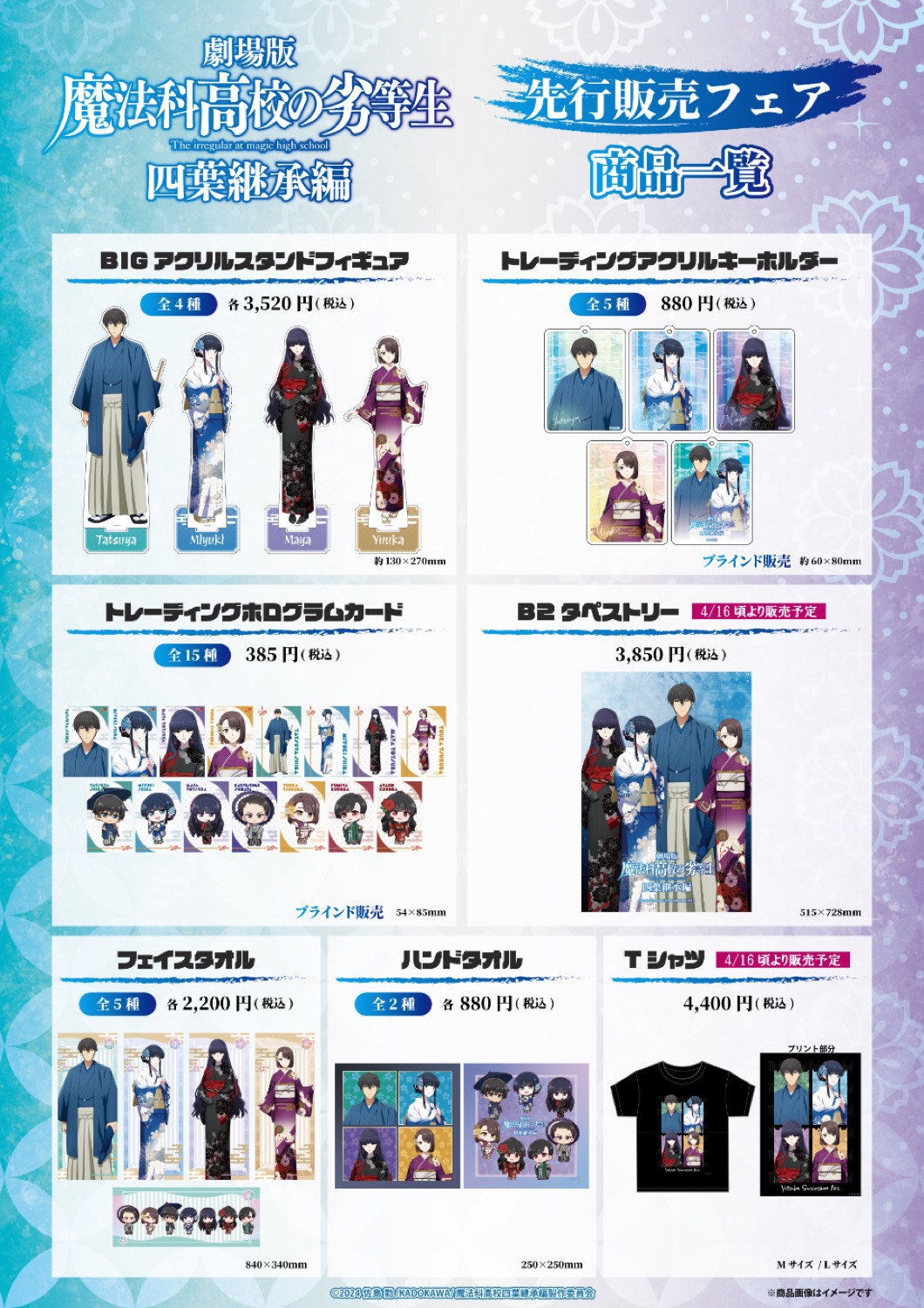 司波達也・司波深雪・四葉真夜・津久葉夕歌たちが、華やかな着物姿で描かれたイラストを使用した「BIG アクリルスタンドフィギュア」「Tシャツ (4月16日頃より販売予定)」「トレーディングアクリルキーホルダー」などがラインナップする。