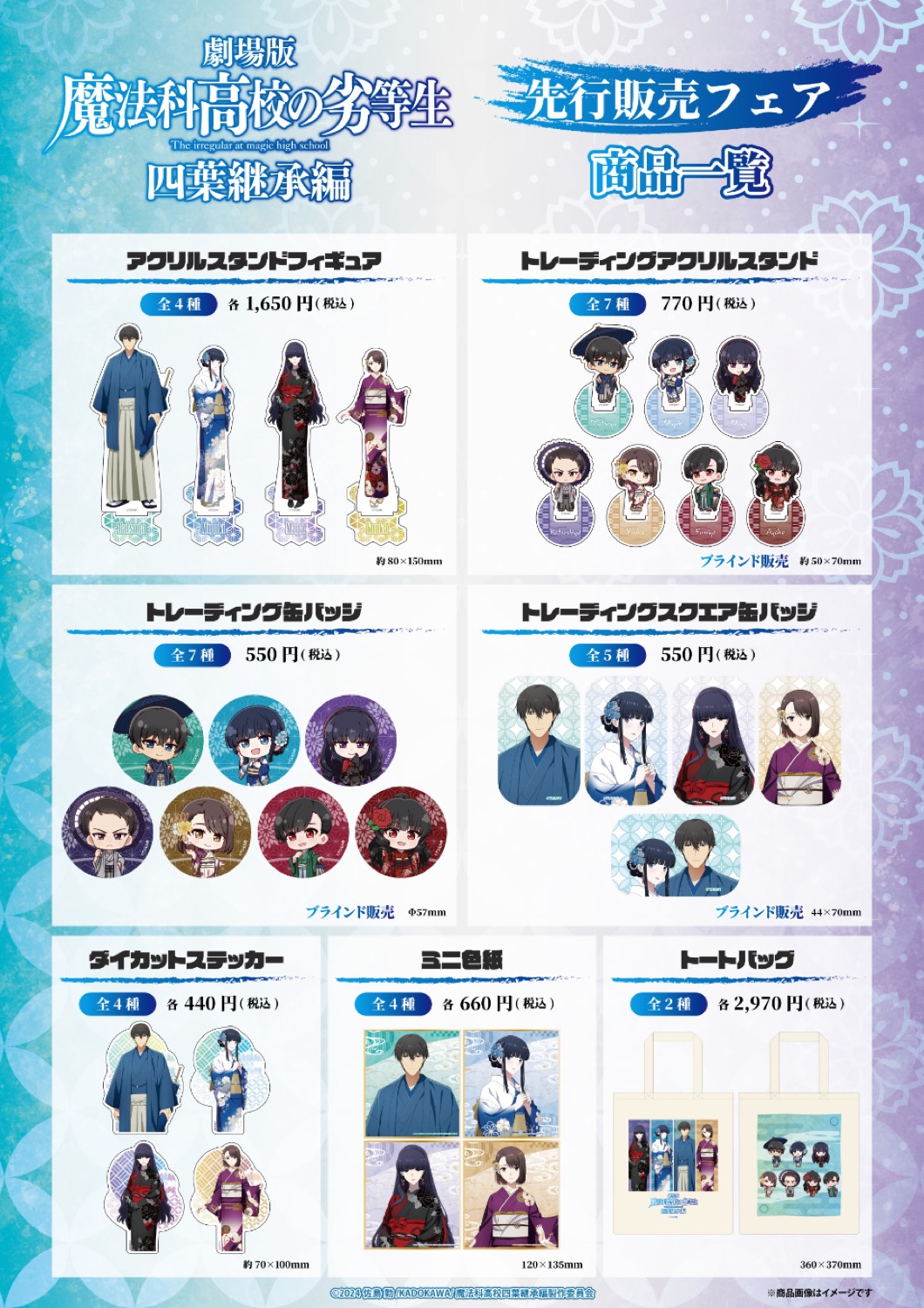 『劇場版「魔法科高校の劣等生 四葉継承編」先行販売フェア』では、司波達也・司波深雪・四葉真夜・津久葉夕歌たちが華やかな着物姿に身を包む、描き下ろしイラストを使用した新作グッズが多数販売!