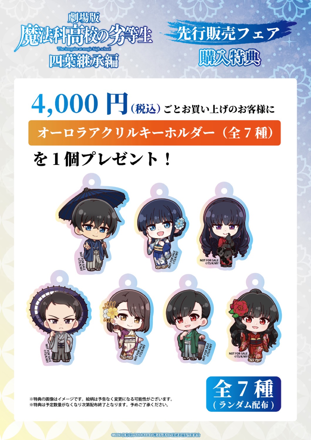 『劇場版「魔法科高校の劣等生 四葉継承編」先行販売フェア』にて、グッズをお買い上げ4,000円(税込)毎に特典として「特製オーロラアクリルキーホルダー 全7種」がランダムに1枚プレゼントされる。