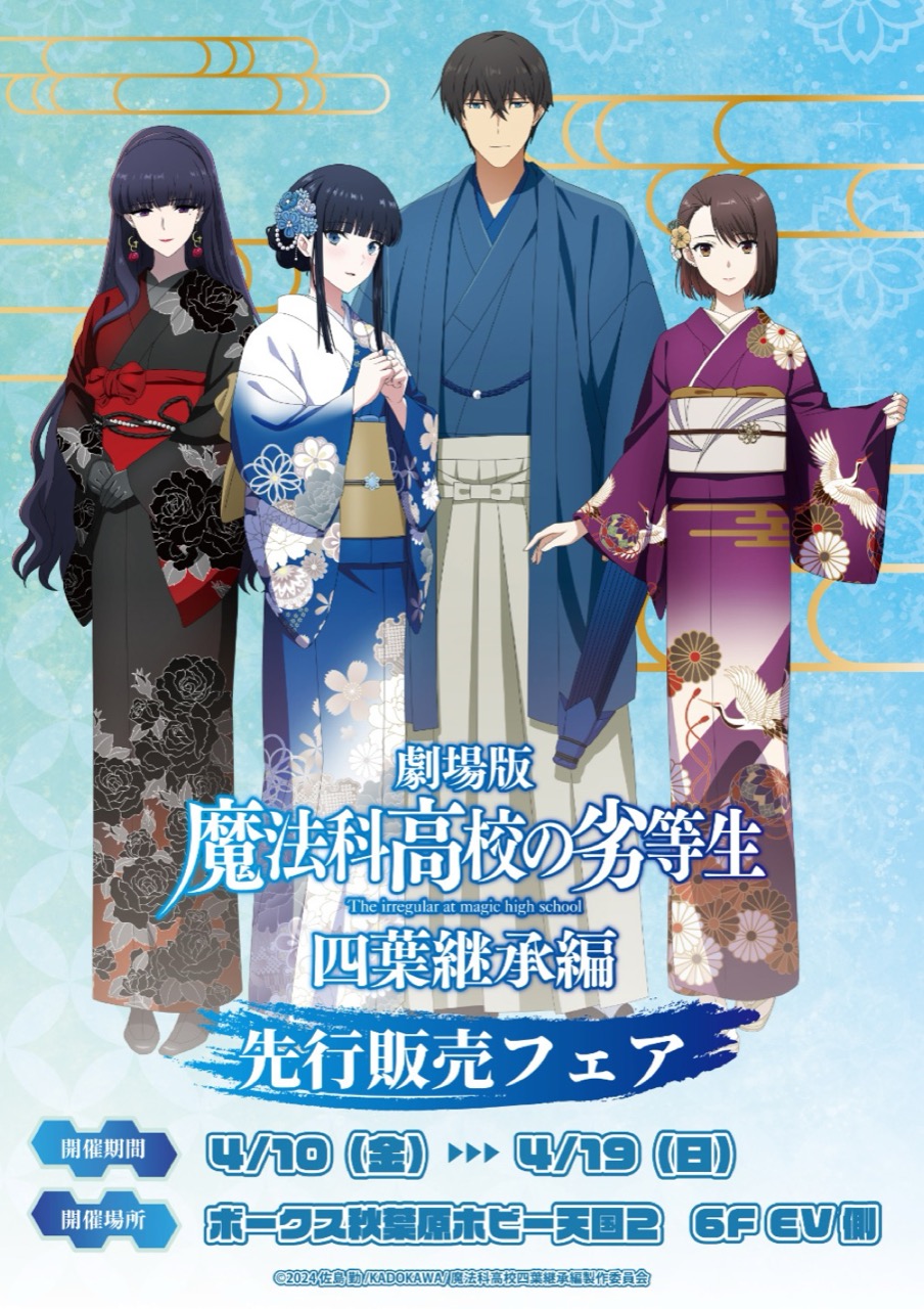 佐島勤先生によるシリーズ累計2000万部突破の大人気ライトノベルを原作とするTVアニメ「魔法科高校の劣等生」の劇場版公開を記念した『劇場版「魔法科高校の劣等生 四葉継承編」先行販売フェア』が、ボークス秋葉原ホビー天国2にて2026年4月10日〜4月19日まで開催される。