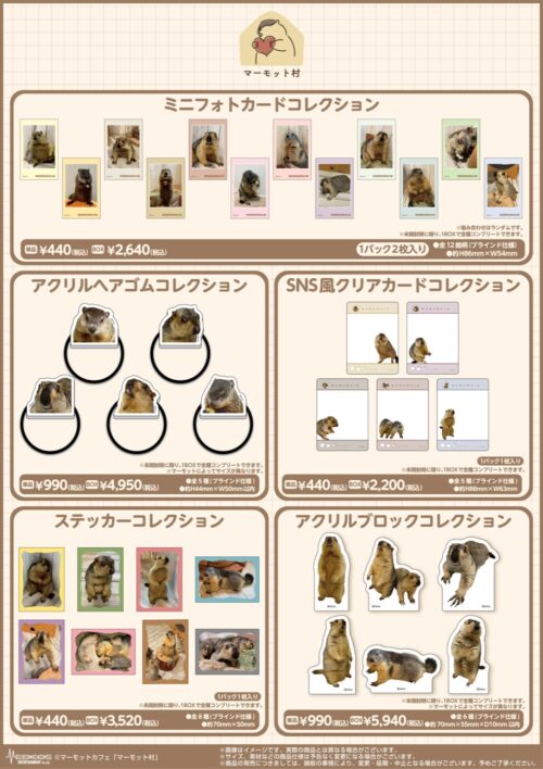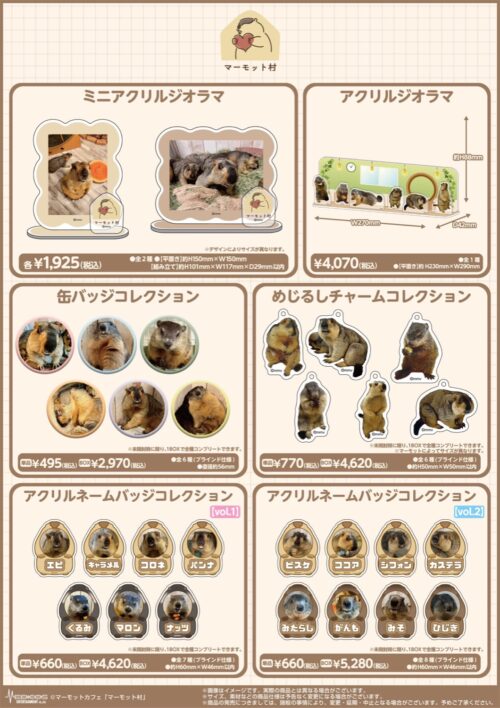 マーモット専門カフェ「マーモット村」の可愛らしいお写真を使用した「アクリルジオラマ」「缶バッジコレクション」「めじるしチャームコレクション」などがラインナップする。