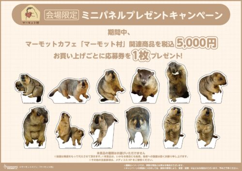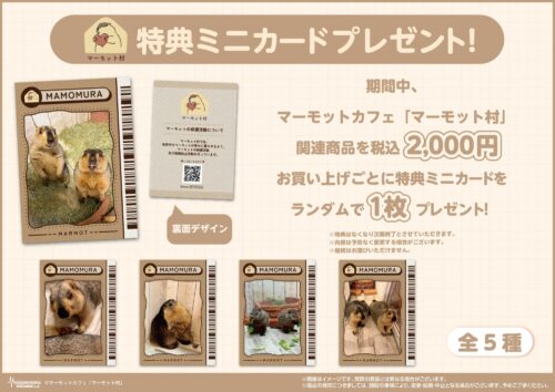 「マーモット村」ポップアップストアにて、グッズをお買い上げ2,000円毎に特典として「ミニカード 全5種」がランダムに1枚プレゼントされる。