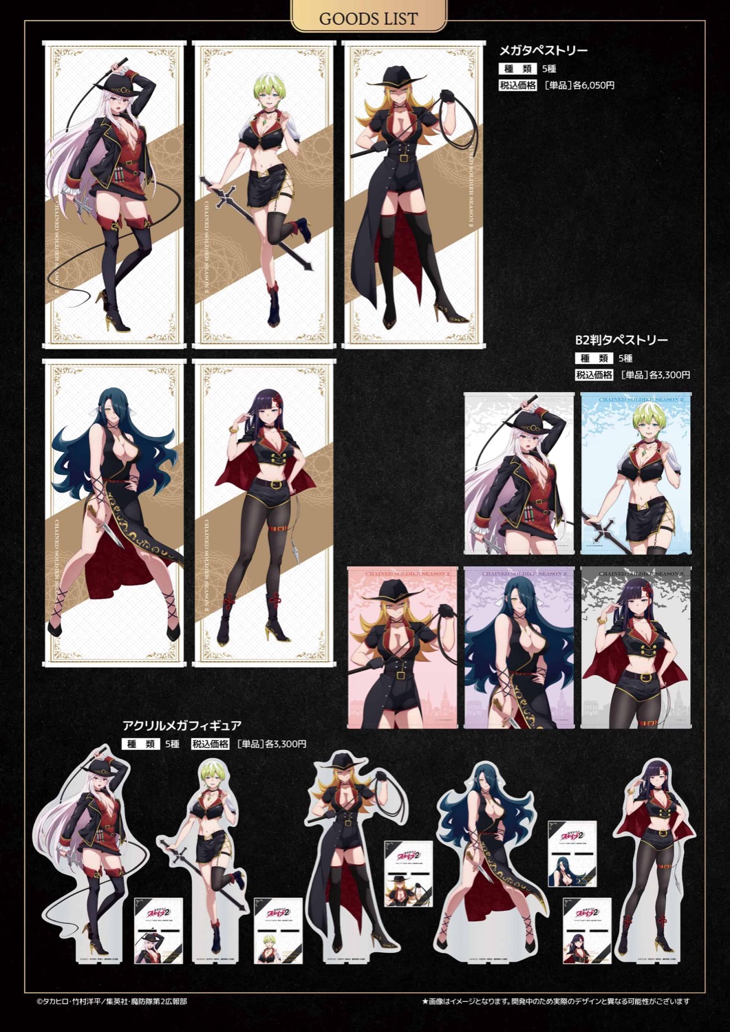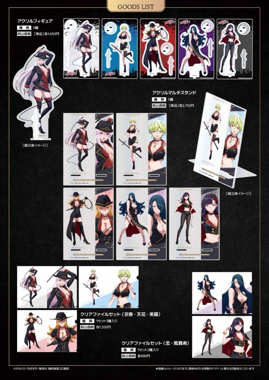 羽前 京香・出雲 天花・上運天 美羅・東 風舞希・山城 恋たちがヴァンパイアハンター衣装に身を包んだイラストを使用した「メガタペストリー」「アクリルメガフィギュア」「アクリルマルチスタンド」「クリアファイルセット」などがラインナップする。