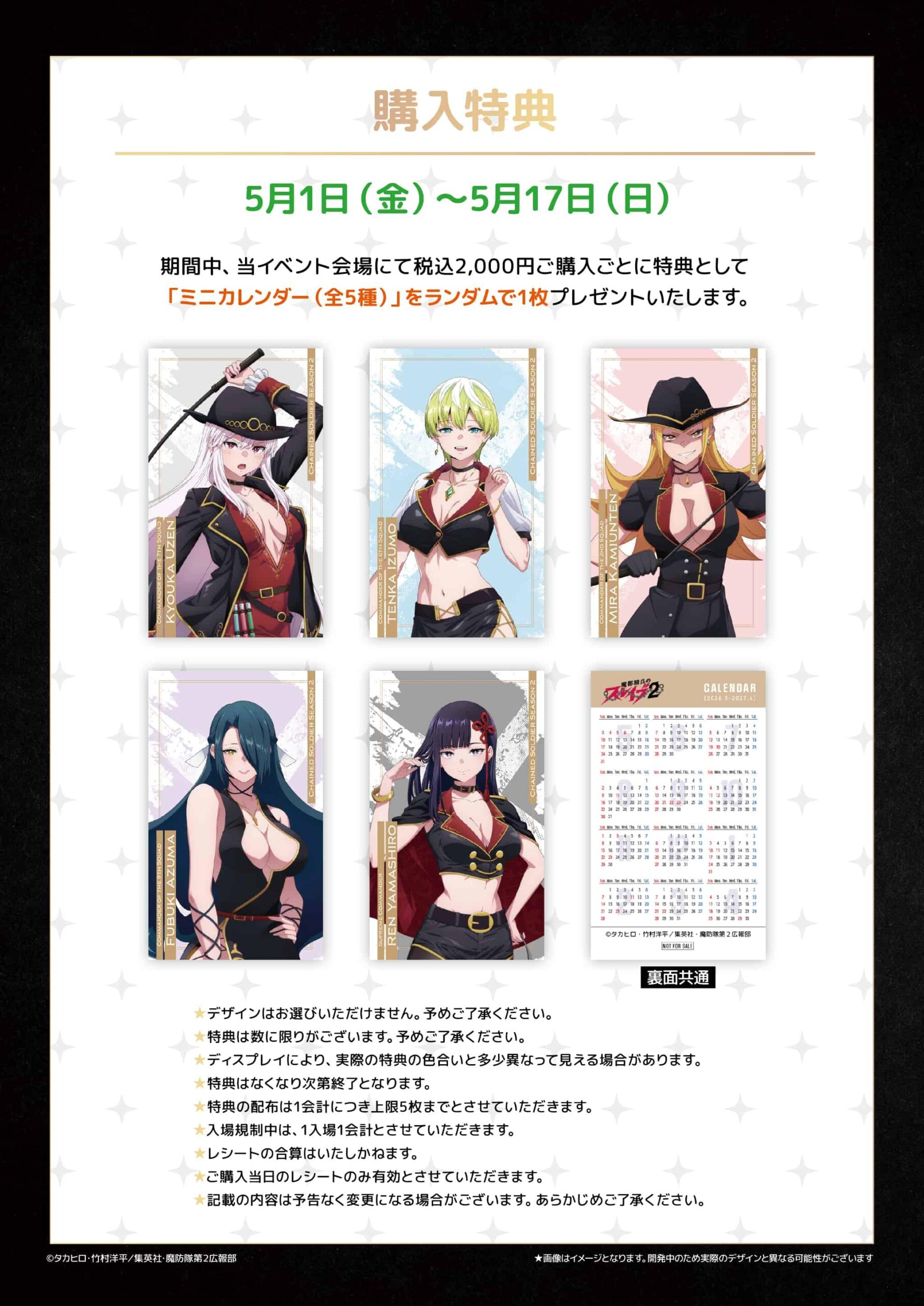 「魔都精兵のスレイブ2 (まとスレ)」ポップアップストアにて、グッズをお買い上げ2,000円(税込)毎に特典として「ミニカレンダー 全5種」がランダムに1枚プレゼントされる。