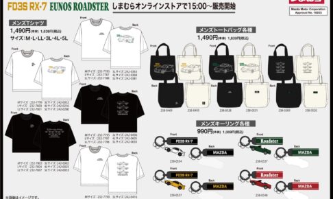 『ユーノスロードスター』と『FD3S RX-7』をクールにあしらった「Tシャツ」「トートバッグ」「キーリング」が展開される。