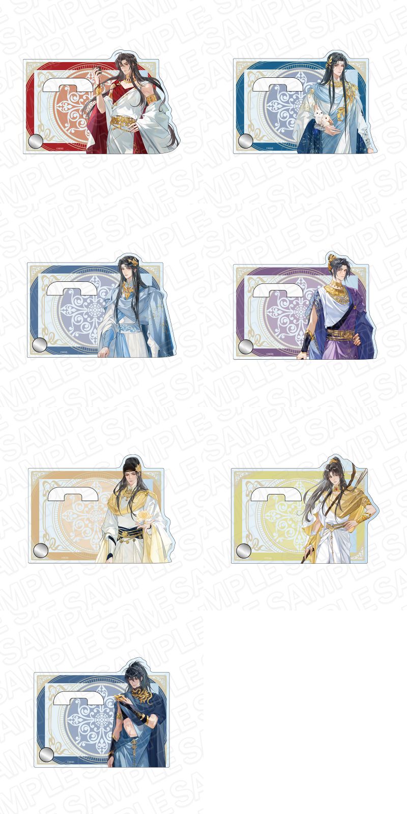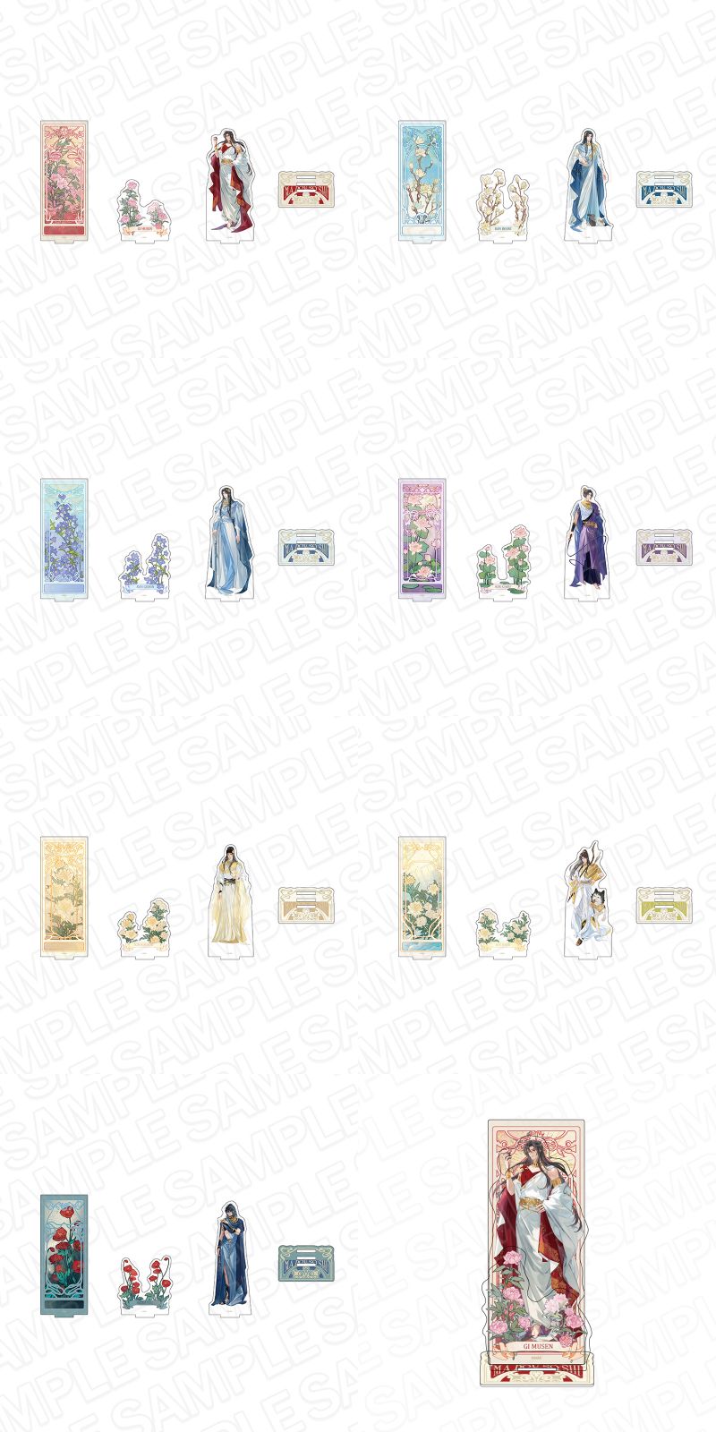 魏無羨、藍忘機、藍曦臣、江澄、金光瑤、金凌、薛洋らを描いた、蝶子先生の超美麗描き下ろしイラストが登場。 グッズには、「カンバッジスタンド」「アクリルジオラマ」「箔押し風ポストカードセット」「ペアラメアクリルキーホルダー」など全5種がラインナップ。