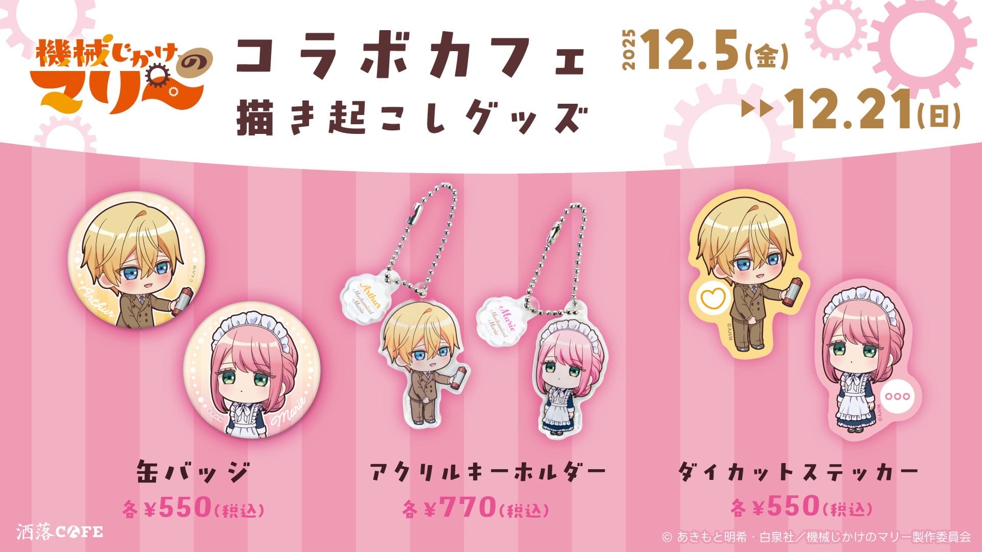 2025年12月5日〜12月21日まで開催される「機械じかけのマリー」カフェでは、新規描き起こしイラストを使用した「缶バッジ」「アクリルキーホルダー」「ダイカットステッカー」などのグッズが登場!
