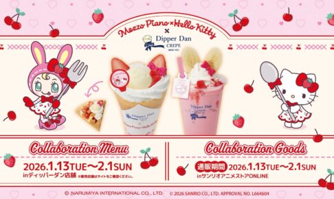 2026年1月13日より全国のディッパーダンにて開催される「メゾピアノ × ハローキティ」コラボでは、メゾピアノのベリエちゃんとハローキティをイメージしてイチゴやクリームをたっぷり使ったコラボクレープ & コラボドリンクが登場!