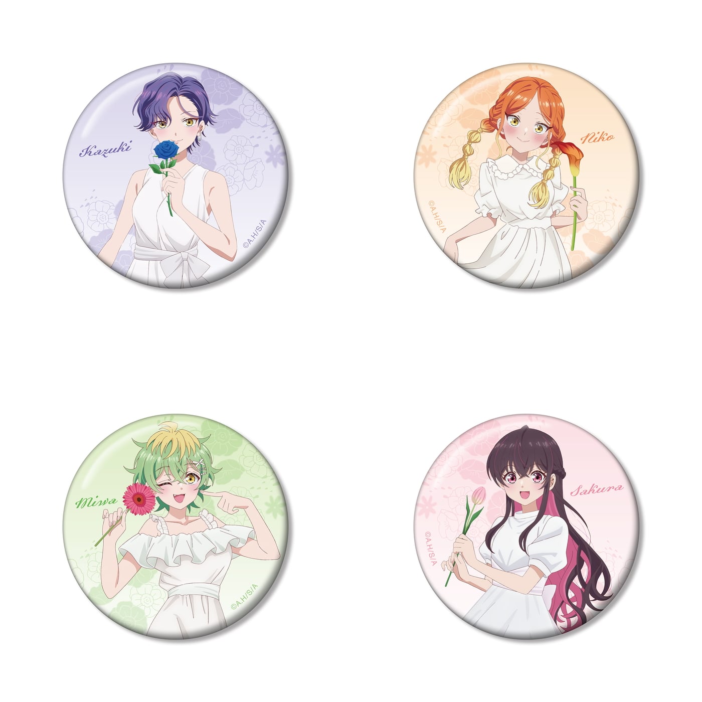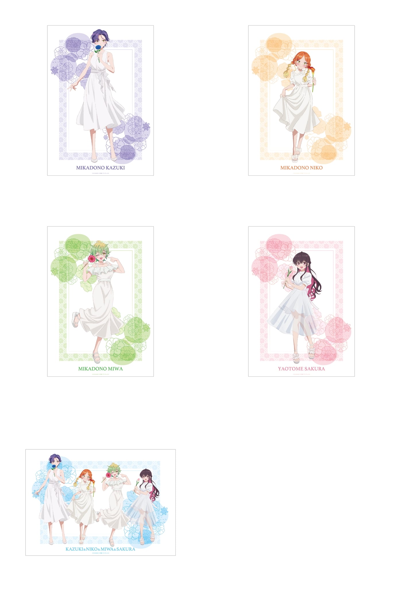 白いワンピースをまとった帝乃一輝、帝乃二琥、帝乃三和、矢乙女桜の4人が、一輪の花を手に柔らかな笑みを浮かべた姿で描かれ、タペストリーやアクリルスタンド、缶バッジなど多彩なアイテムが展開される。