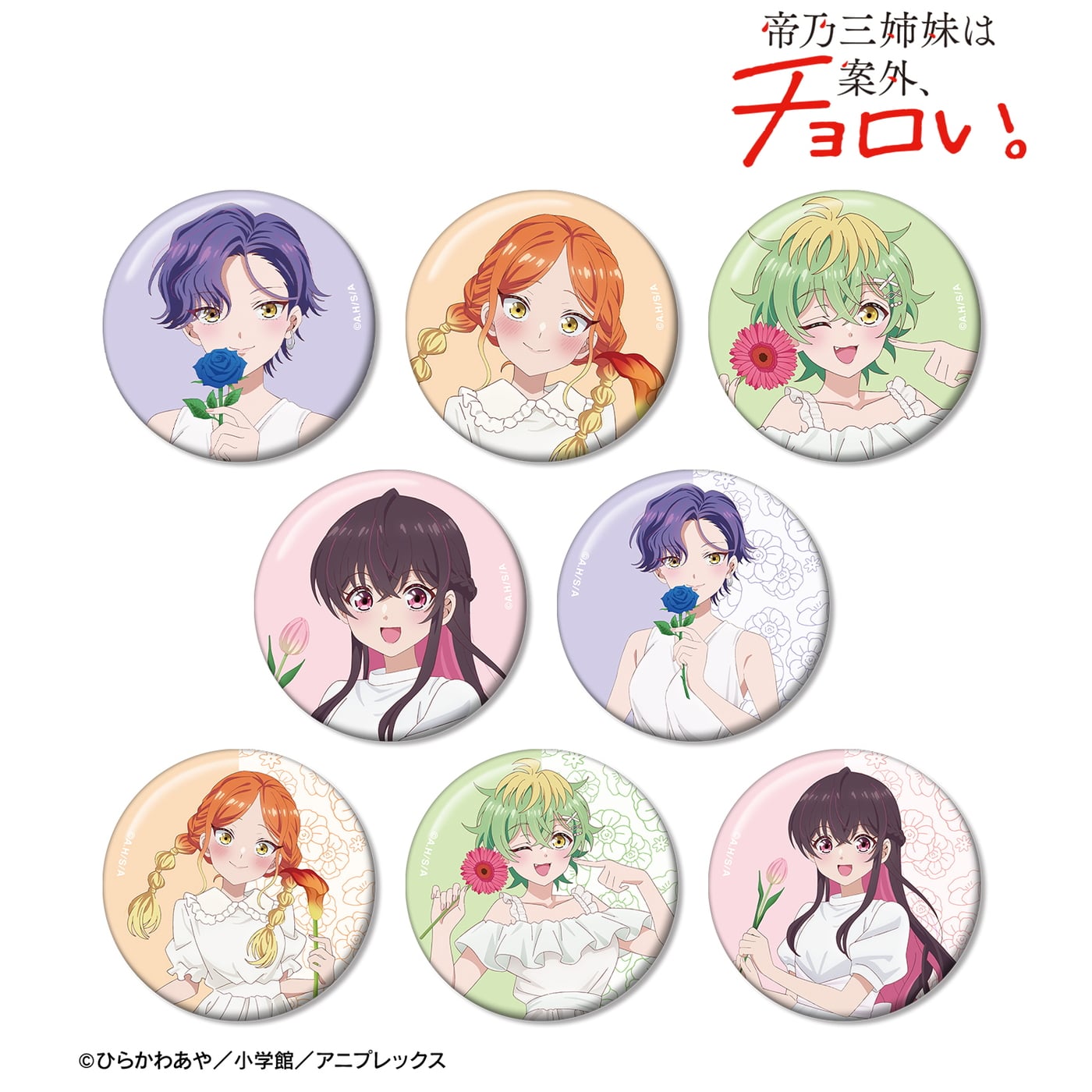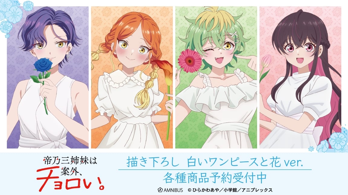 ひらかわあや先生による人気漫画を原作としたTVアニメ「帝乃三姉妹は案外、チョロい。」から、白いワンピースと花 ver.描き下ろしイラストを使用した新作グッズが登場。