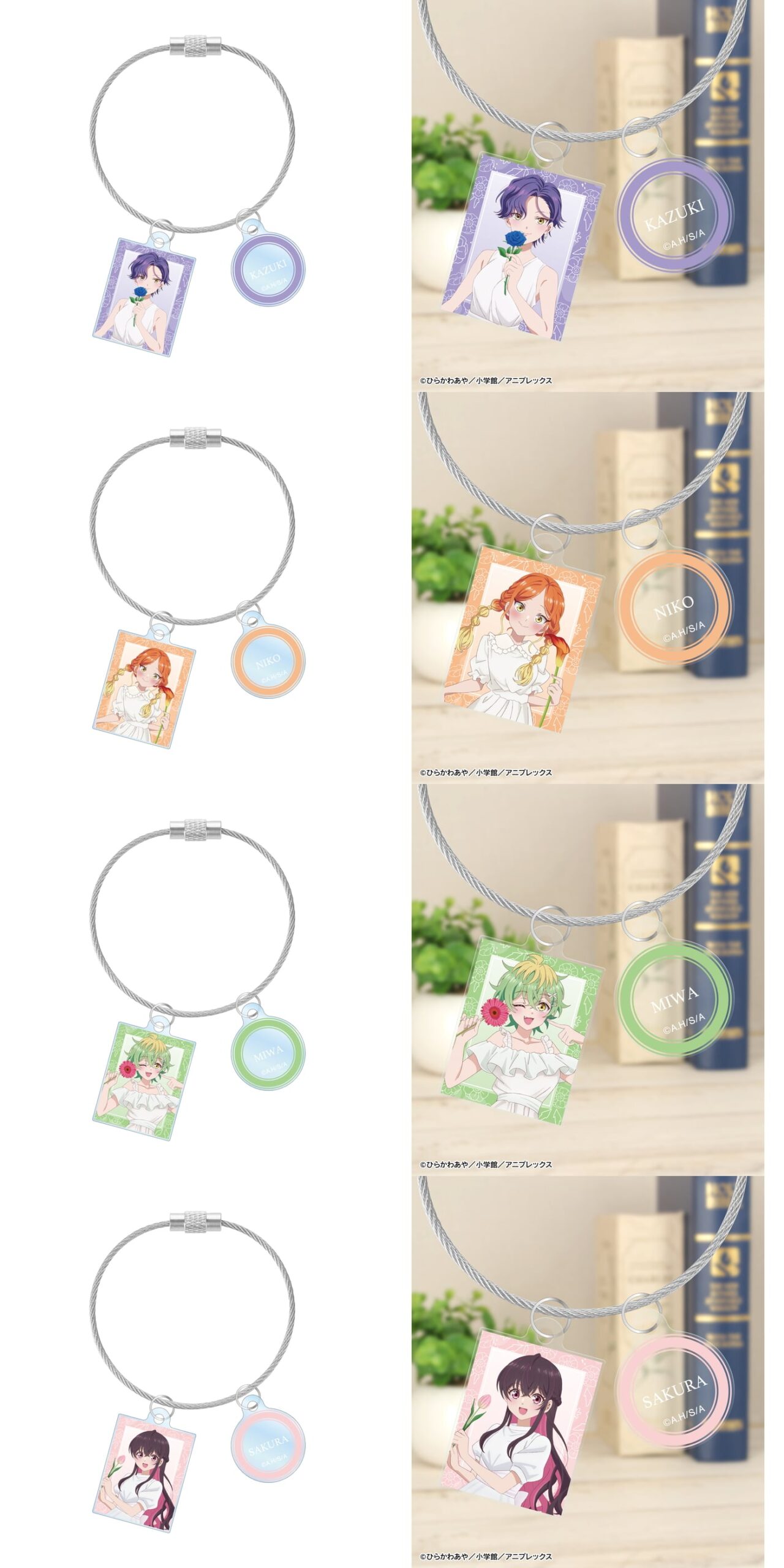 描き下ろし 白いワンピースと花ver. 2連ワイヤーアクリルキーホルダー 各990円(税込)