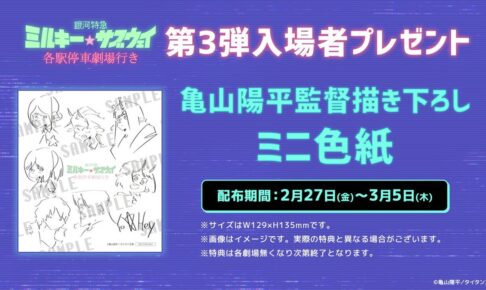 2026年2月27日より、劇場版映画「銀河特急 ミルキー☆サブウェイ 各駅停車劇場行き」の上映劇場にて、第3弾入場者プレゼント「亀山陽平監督描き下ろしミニ色紙」が配付される。