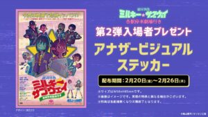 「亀山陽平」先生が監督・脚本・キャラクターデザイン・制作を務める「銀河特急 ミルキー☆サブウェイ」の劇場版映画「銀河特急 ミルキー☆サブウェイ 各駅停車劇場行き」の第2弾入場者特典情報が解禁!2026年2月20日より第2弾入場者プレゼントとして「アナザービジュアルステッカー」が配付される。