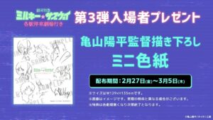 「亀山陽平」先生が監督・脚本・キャラクターデザイン・制作を務める劇場版映画「銀河特急 ミルキー☆サブウェイ 各駅停車劇場行き」の第3弾入場者特典情報が解禁!2026年2月27日〜3月7日までの期間第3弾入場者特典として「亀山陽平監督描き下ろしミニ色紙」が配付される。