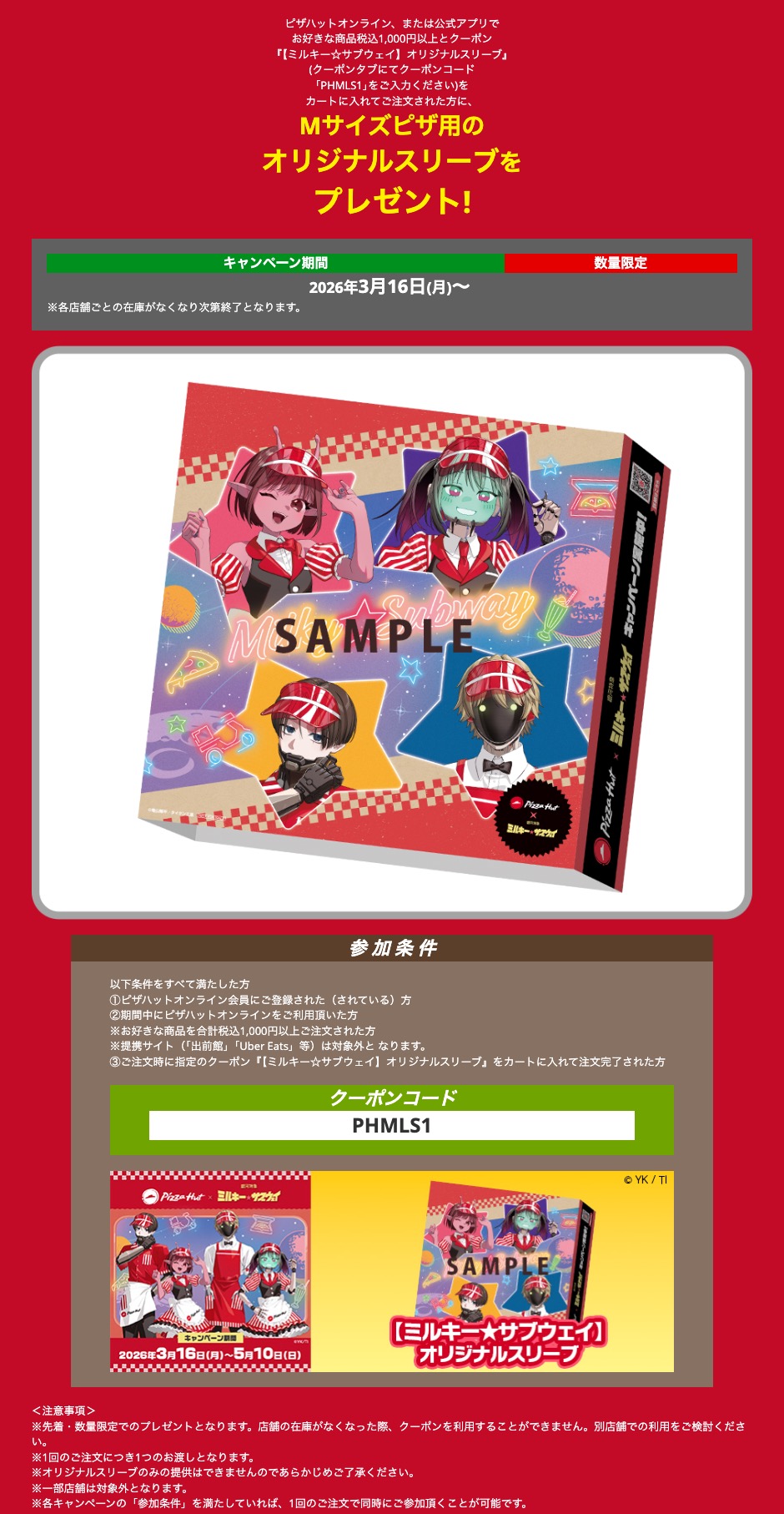 2026年3月16日より開催される『ミルキーサブウェイ × ピザハット』コラボでは、1,000円(税込)以上+指定のクーポンを注文すると「オリジナルスリーブ」をプレゼント!