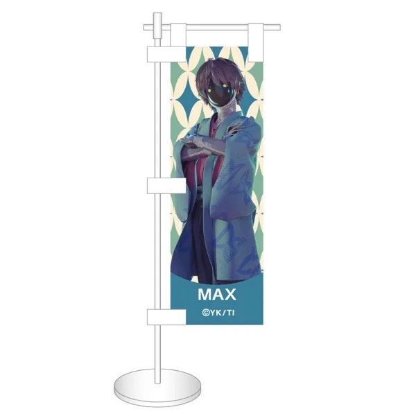 チハル・マキナ・カート・マックス・アカネたちをデザインした「ミニのぼり」や「アクリルスタンドフィギュア」「ミニブロマイド&ステッカーセット」などのグッズがラインナップ!