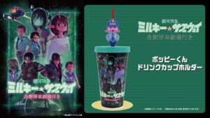 「亀山陽平」先生が監督・脚本・キャラクターデザイン・制作を務める「銀河特急 ミルキー☆サブウェイ」の劇場版映画「銀河特急 ミルキー☆サブウェイ 各駅停車劇場行き」の全国上映劇場にて『ポッピーくんドリンクカップホルダー』が登場!ドリンクを飲みながら『ポッピーくん』のあの表情を独り占めすることが出来る。