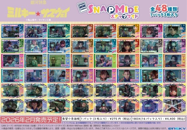 「亀山陽平」氏が監督・脚本・キャラクターデザイン・制作を務めるTVアニメ「銀河特急 ミルキー☆サブウェイ」から、スナップ写真風のカードコレクション「スナップマイド」が2026年2月に発売される。