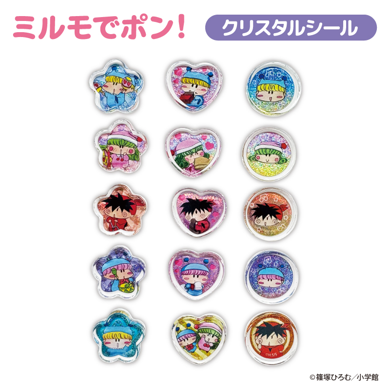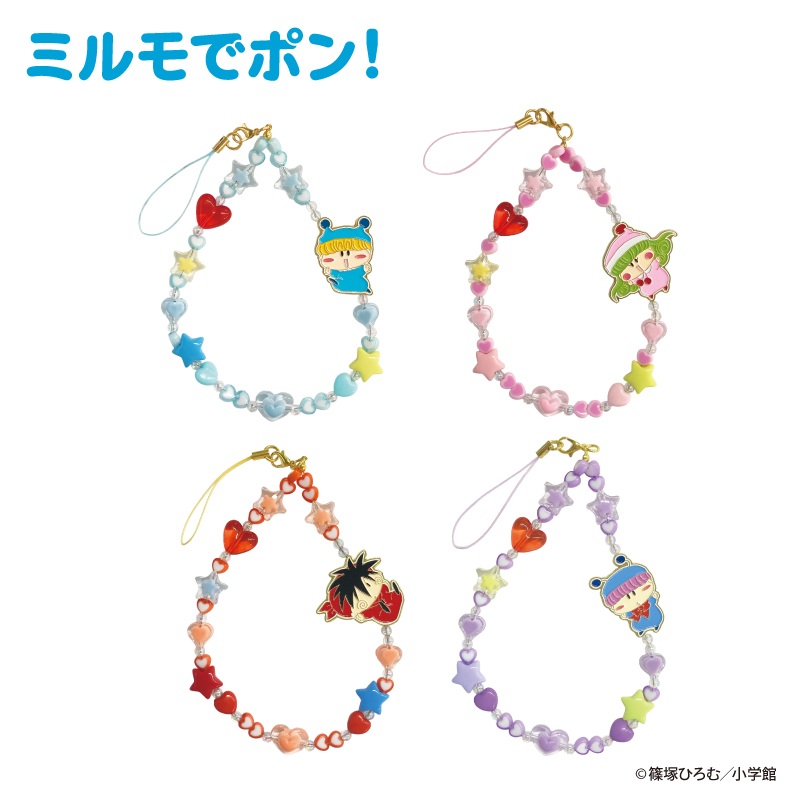 ミルモ、リルム、ヤシチ、ムルモら4人の妖精たちの「クリスタルシール」や「タイルシール」などシール関連アイテムをはじめ、ちゃおっ娘心くすぐられるビーズがいっぱい「フォンストラップ」など多数ラインナップ。