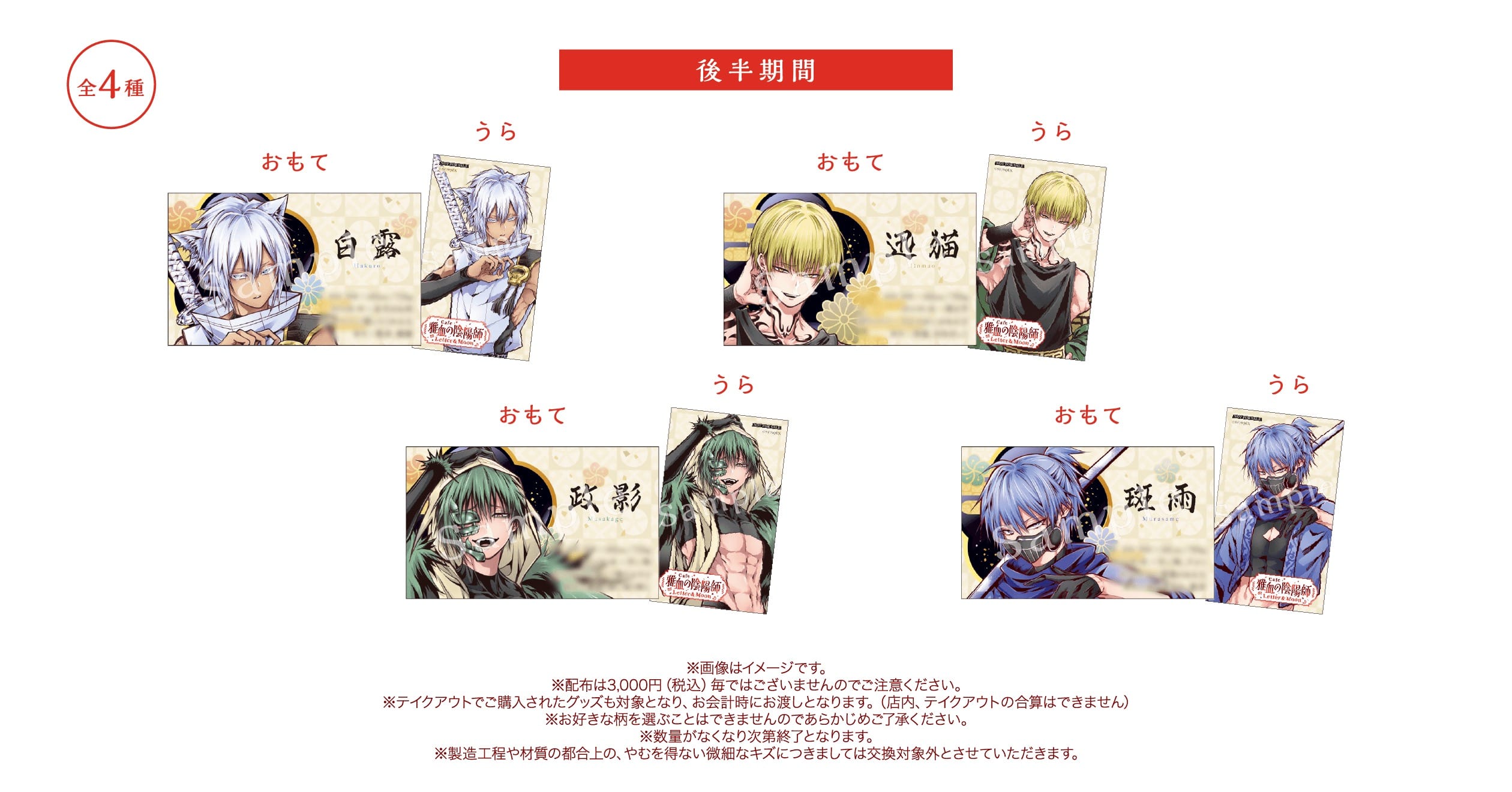 さらに、店内利用で「ランチョンマット (全3種)」を、1回の来店でグッズを3,000円(税込)以上購入すると「名刺風カード (前半4種/後半4種)」がそれぞれランダムに1枚プレゼントされる。